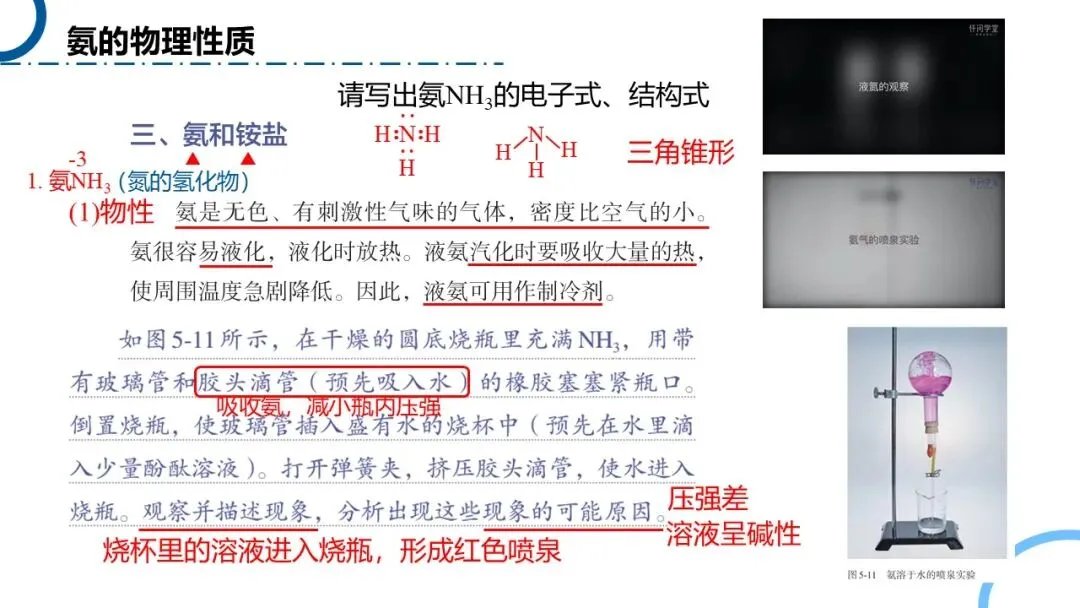介绍氨的结构和物理性质,重点是喷泉实验。