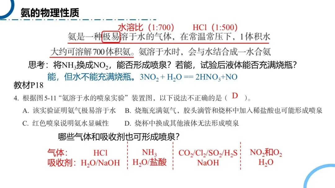喷泉实验不仅反映了物理性质,也包含了氨和水反应的化学变化。这里包含了平衡和微粒判断,以及易混物质的对比。