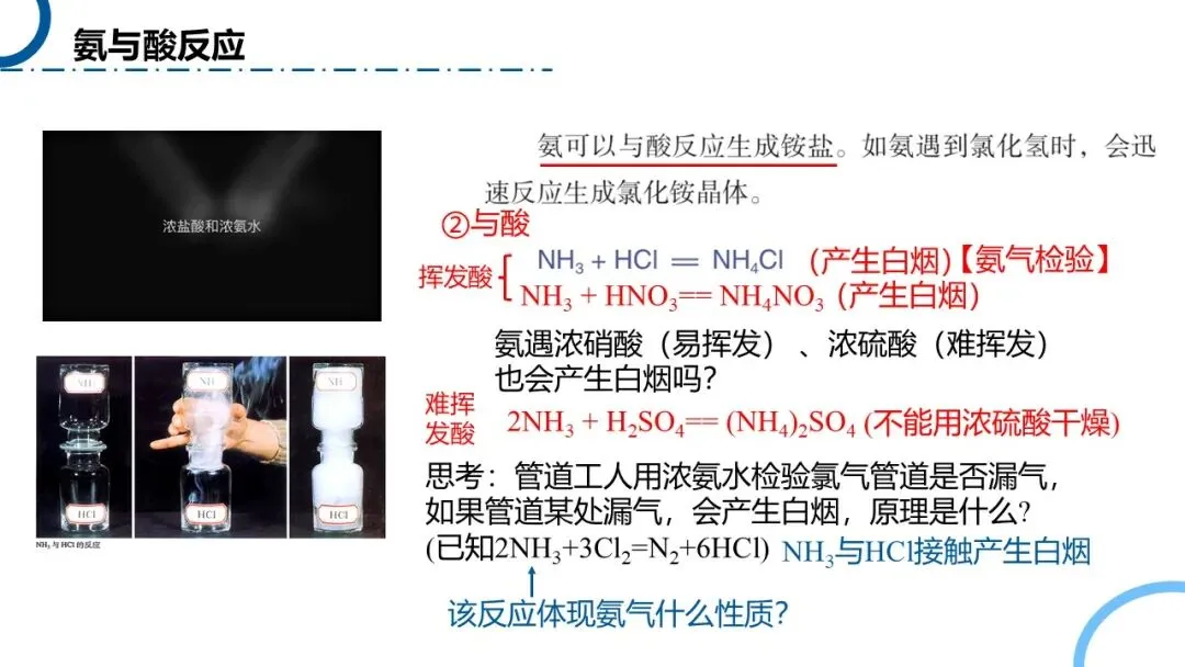 氨,作为碱性气体,不仅可以和水反应,还可以和酸反应生成盐。最后借助一个检验氯气的例子,过渡到氨的还原性。