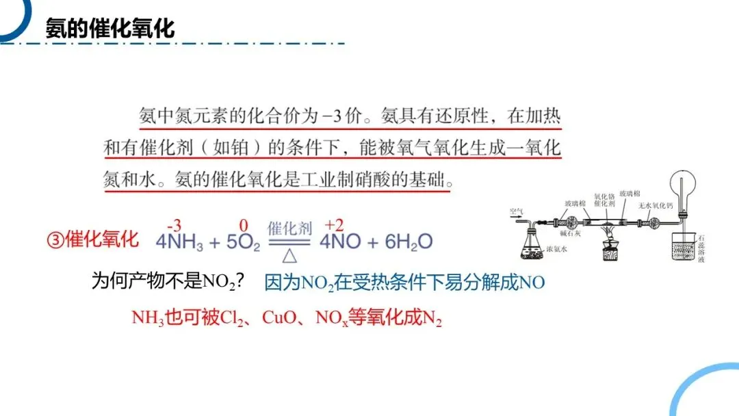 氨的催化氧化,也是重点,产物是一氧化氮,原理讲明白。