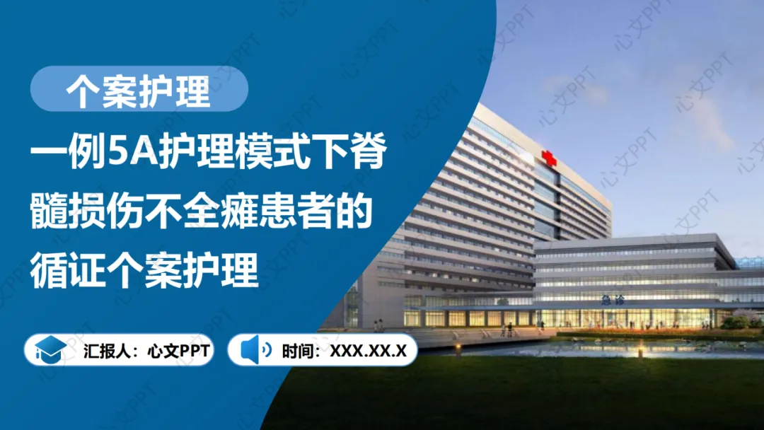 我是今天的汇报人,来自XX科室。今天我分享的题目是《一例5A护理模式下脊髓损伤不全瘫患者的循证个案护理》