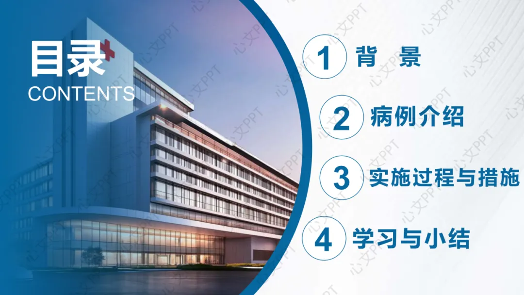 接下来,我将从四个方面进行汇报:首先是背景,然后是病例介绍,接着是实施过程与措施,最后是学习与小结。