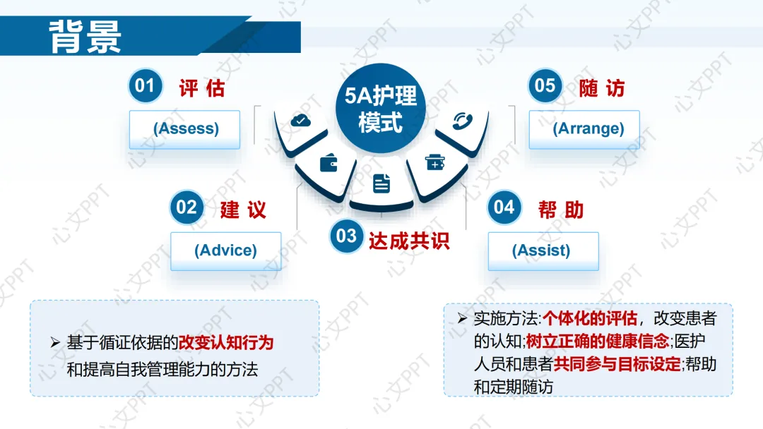 我们采用5A护理模式,即评估、建议、达成共识、帮助和随访五个步骤。