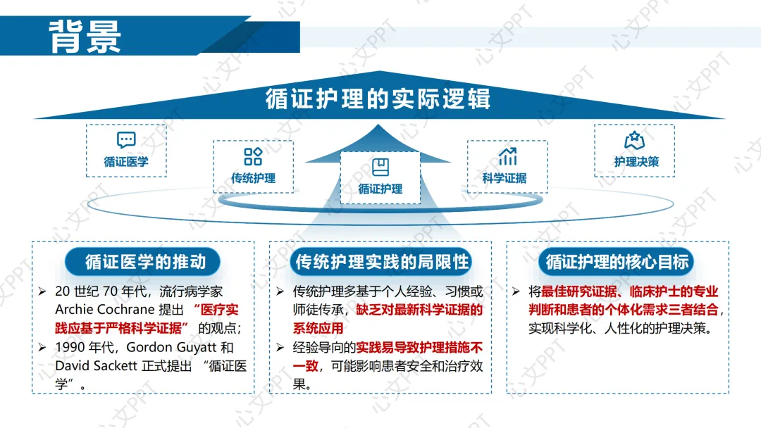 循证医学的发展为我们提供了方向。从20世纪70年代Cochrane提出“医疗应基于科学证据”,到90年代循证医学正式提出,我们逐步意识到,传统护理多依赖经验,缺乏统一标准。而循证护理,正是将最佳证据、专业判断和患者需求三者结合,推动护理走向科学化、个性化。