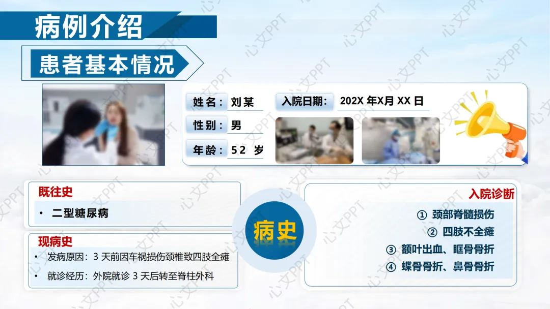 患者XX,X性,XX岁,因车祸导致颈椎损伤,入院时四肢全瘫。既往有2型糖尿病史。入院诊断为颈部脊髓损伤、四肢不全瘫,同时伴有颅内出血、眶骨骨折等多发伤。