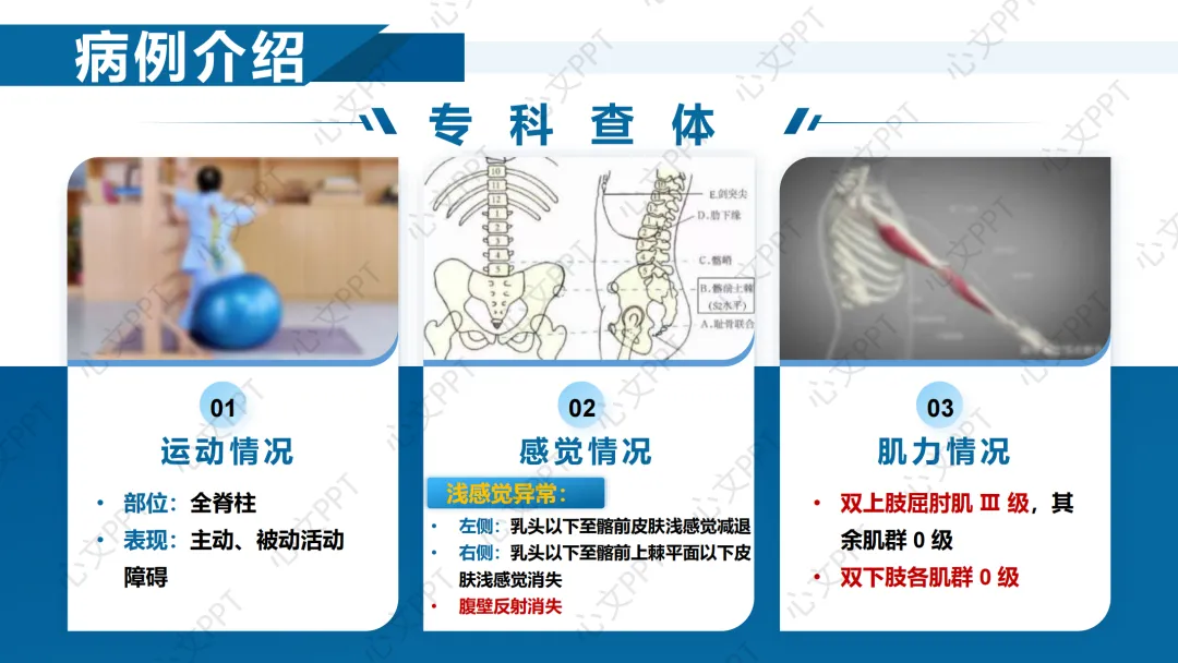 在运动、感觉和肌力方面,患者双上肢屈肘肌力Ⅲ级,其余肌群0级,双下肢全部0级,左侧感觉减退,右侧感觉消失,腹壁反射消失。