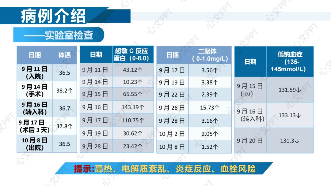 实验室检查显示,患者入院后出现高热、D-二聚体升高、低钠血症等,提示存在感染、电解质紊乱及血栓风险。这些都为后续护理提出了挑战。