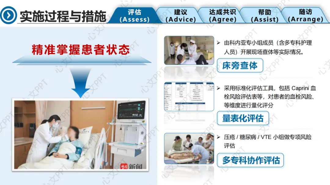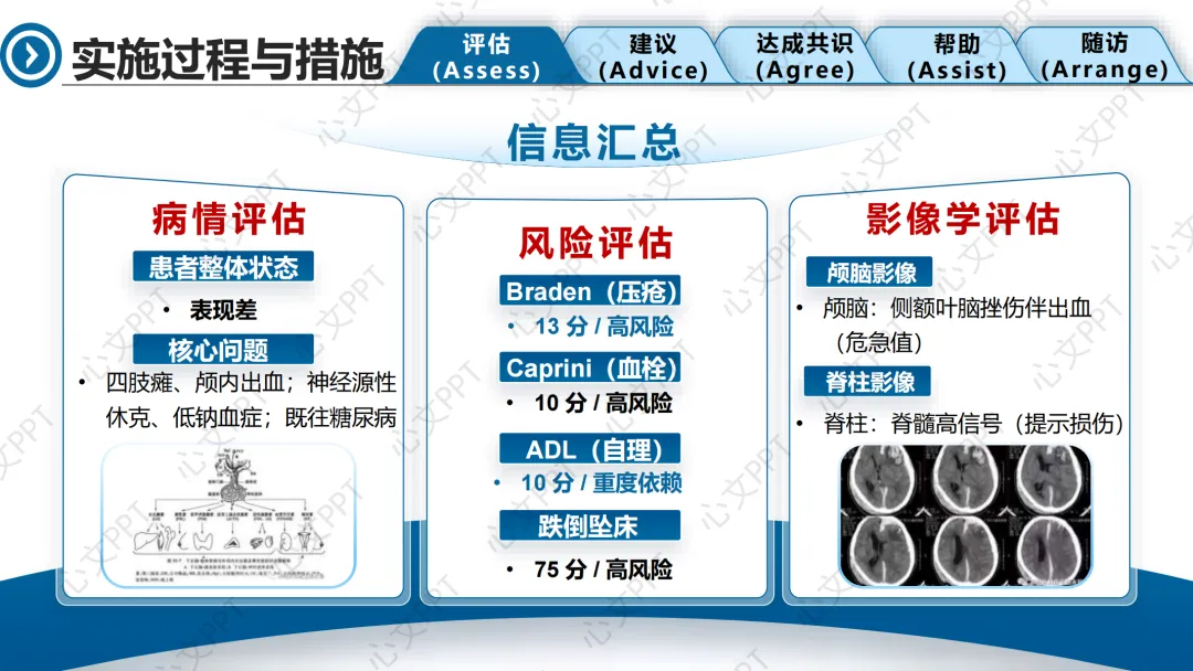 在评估阶段,我们通过床旁查体、量表评估和多专科协作,全面掌握患者状态。Braden评分13分,压疮高风险;Caprini评分10分,VTE高风险;ADL评分10分,重度依赖。影像学提示颅内出血和脊髓损伤。