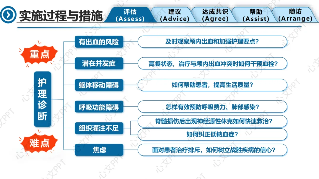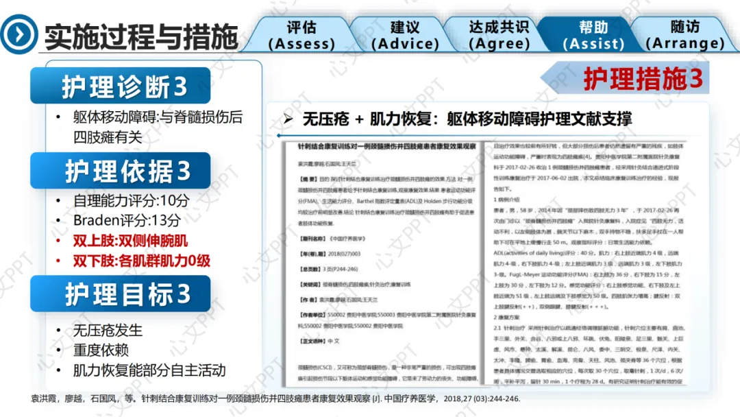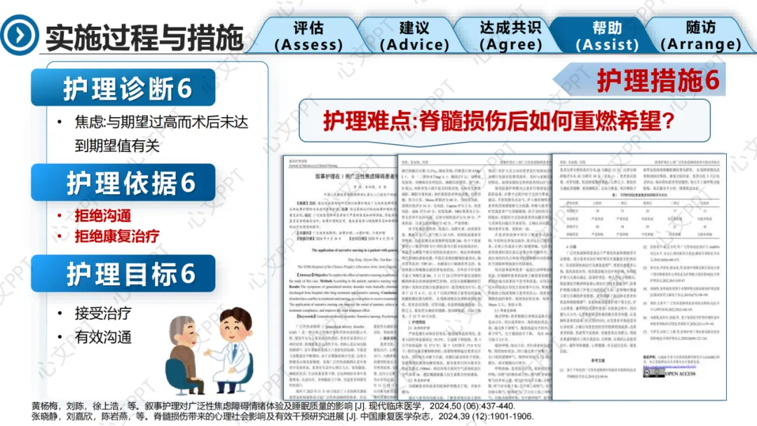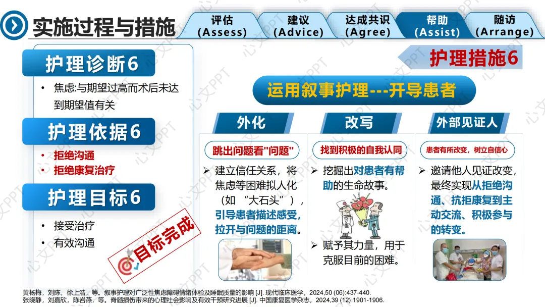 最后一个诊断是“焦虑”,患者术后情绪低落,拒绝沟通和治疗。我们引入叙事护理,通过倾听、共情和陪伴,帮助患者重建信心,逐步配合康复。