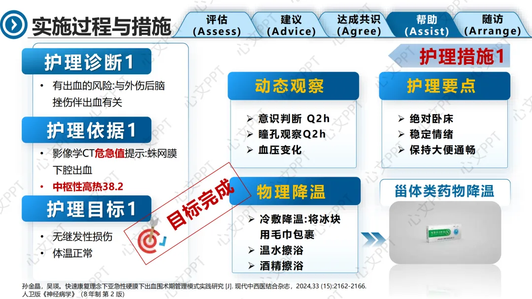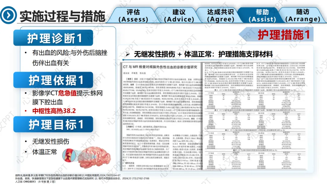 第一个护理诊断是“有出血风险”,基于CT提示蛛网膜下腔出血。我们目标是防止继发性损伤,控制中枢性高热。
