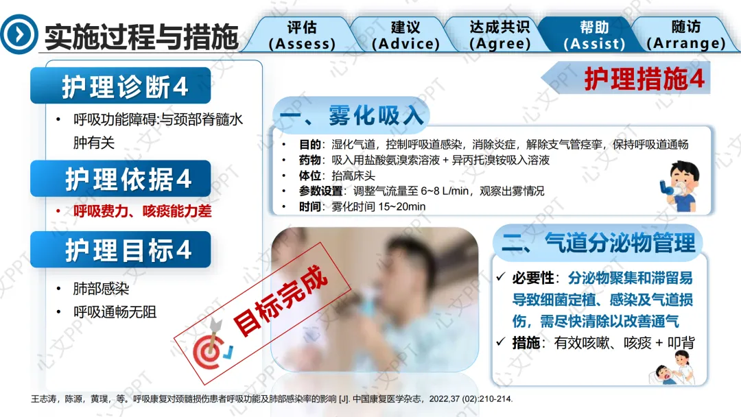 第四个诊断是“呼吸功能障碍”,患者呼吸费力、咳痰差。我们通过缩唇呼吸、腹式呼吸和吹纸条训练,改善通气功能,预防肺部感染。