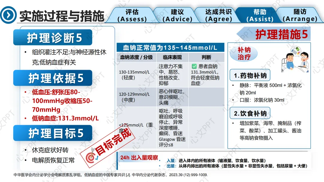 第五个诊断是“组织灌注不足”,与神经源性休克和低钠血症有关。我们通过体位管理、液体复苏、升压药物和补钠治疗,逐步稳定患者生命体征。