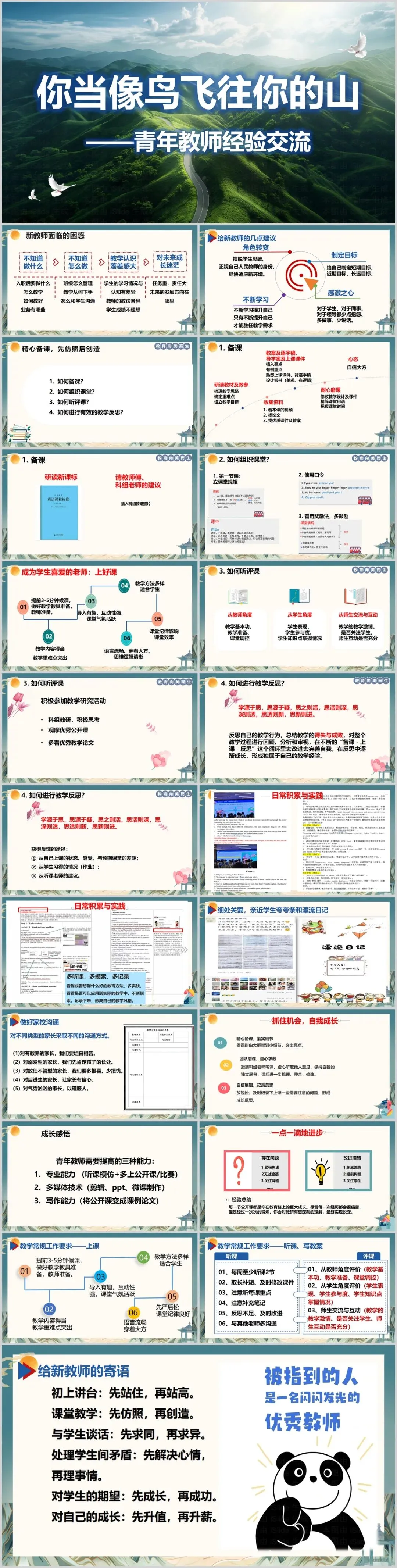 这份《你当像鸟飞向你的山》青年教师成长经验 源于实践、指导实践,体系完整。它不仅仅是一次分享记录,更是一套能够帮助学校系统化、课程化地支持新教师度过职业适应期、实现快速成长的珍贵参考资料。用好这份青年教师成长经验资源,能为学校的师资队伍建设注入温暖而坚实的力量。