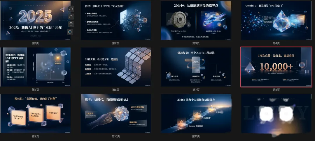 主题:【2025我做AI博主的一年】 用途:【回顾自己的历程,给粉丝展示价值】 受众:【使用AI工具提效的人】 演讲时长:【10】分钟 页数范围:【12】页 讲述者身份:【AI自媒体博主】 讲述者背景与关键数据:【2025年年底开始做AI博主,发了大概有20多篇文案,主要是和AI工具提效PPT相关的。目前有1万点赞全网1000+粉丝。】