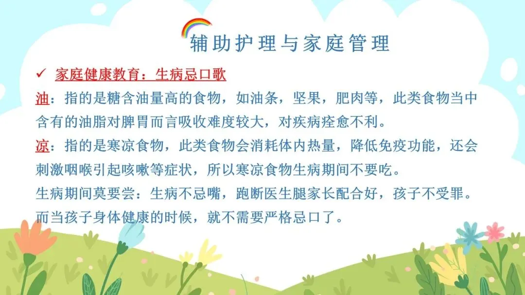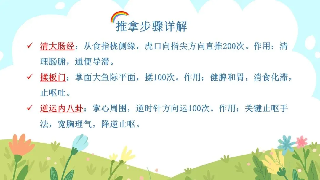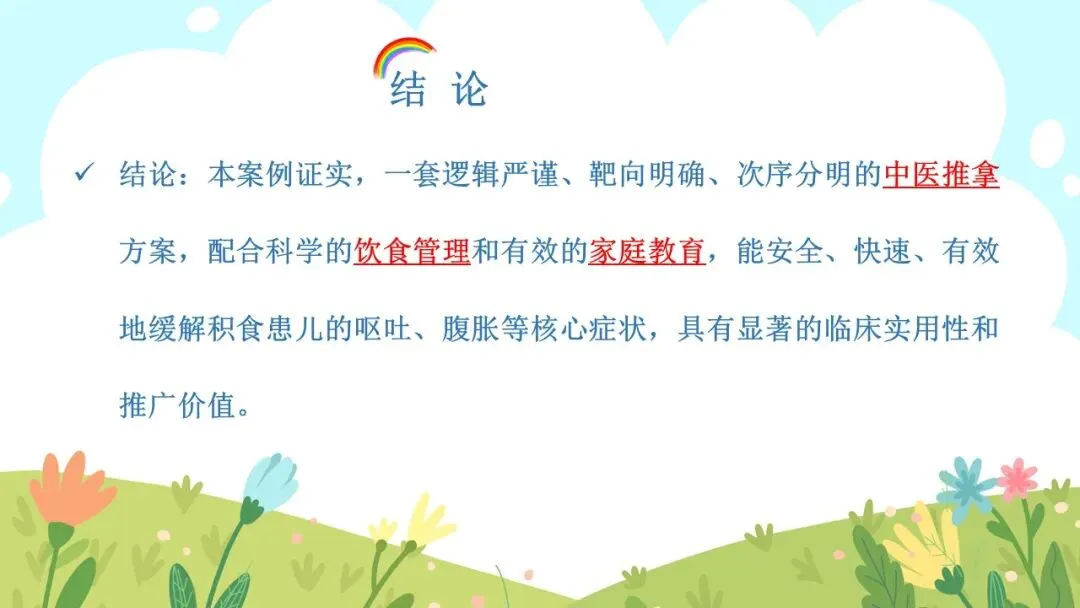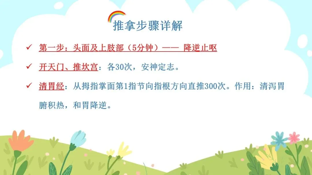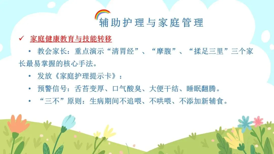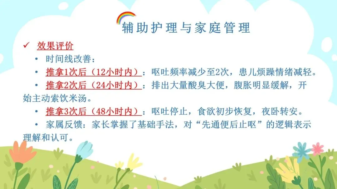同时,课件补充饮食干预、家庭手法教学、忌口原则等实用内容,搭配“生病忌口歌”及护理提示卡,强化家庭照护延续性。通过清晰的效果评价时间线,印证方案的临床有效性,兼具理论深度与实操性。 整体结构层次分明,从病例分析到方案设计、操作详解,再到家庭管理与效果验证,形成完整知识体系,助力学习者快速掌握小儿积食呕吐的中医推拿护理核心技能,具有较高的临床推广与家庭应用价值。