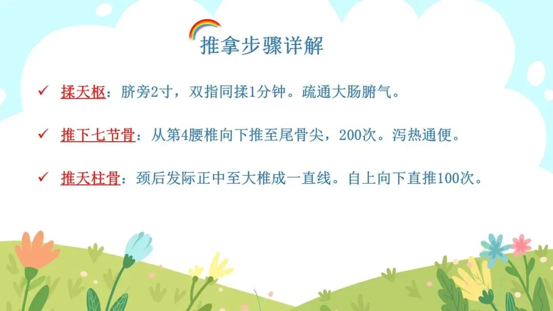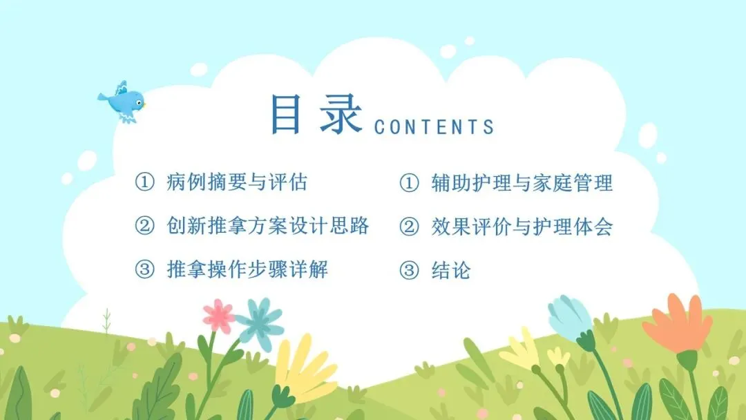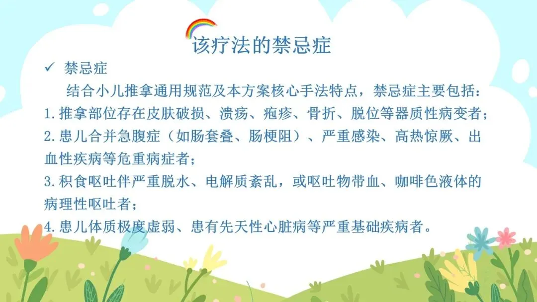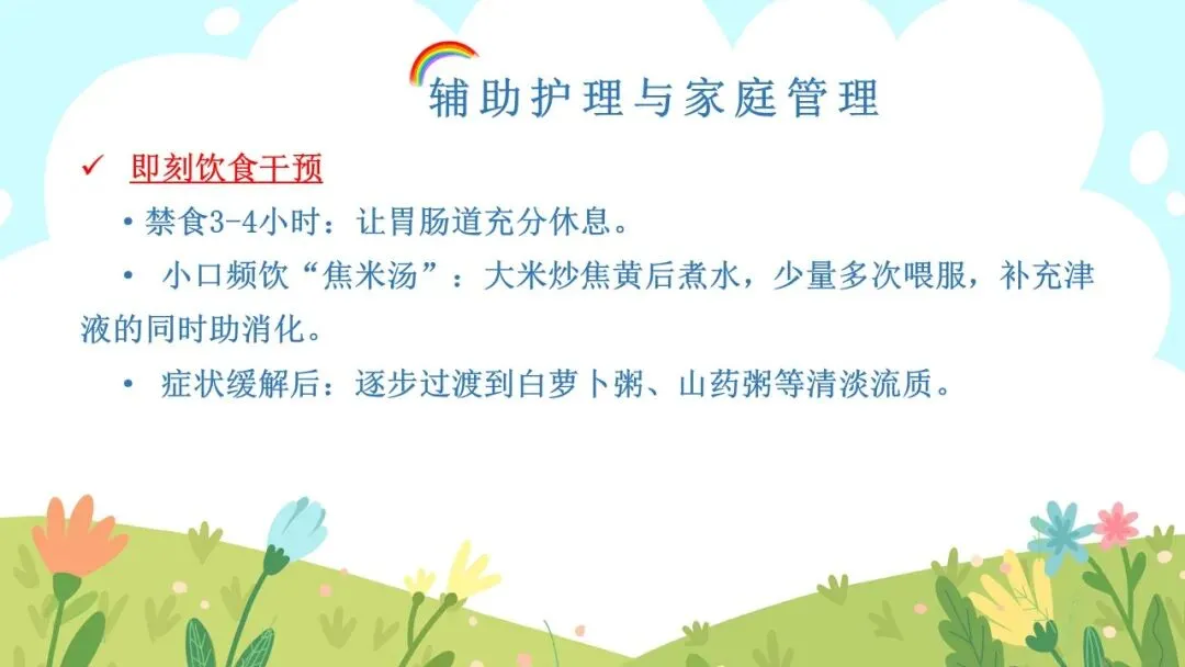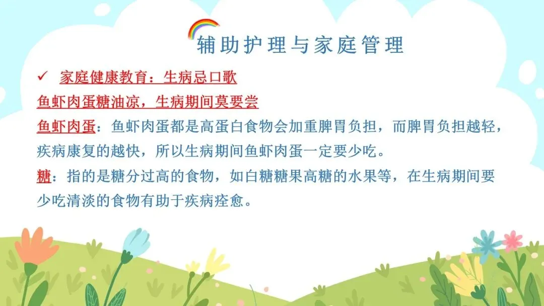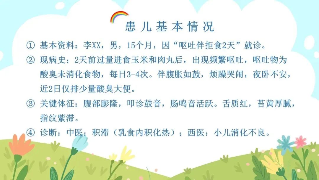 同时,课件补充饮食干预、家庭手法教学、忌口原则等实用内容,搭配“生病忌口歌”及护理提示卡,强化家庭照护延续性。通过清晰的效果评价时间线,印证方案的临床有效性,兼具理论深度与实操性。 整体结构层次分明,从病例分析到方案设计、操作详解,再到家庭管理与效果验证,形成完整知识体系,助力学习者快速掌握小儿积食呕吐的中医推拿护理核心技能,具有较高的临床推广与家庭应用价值。