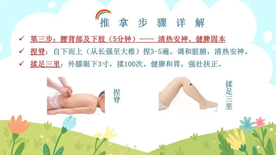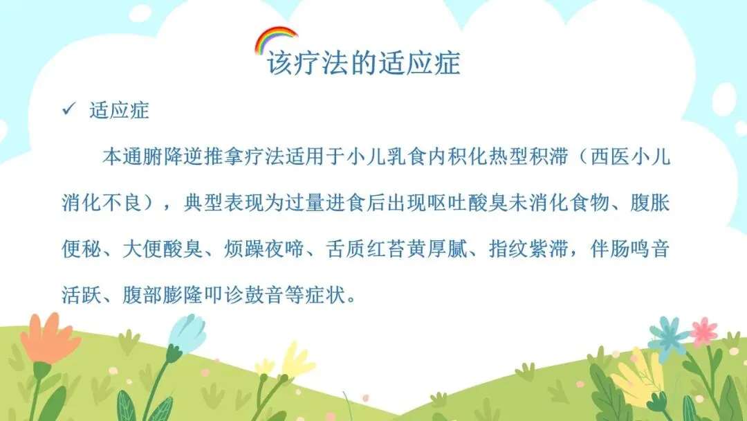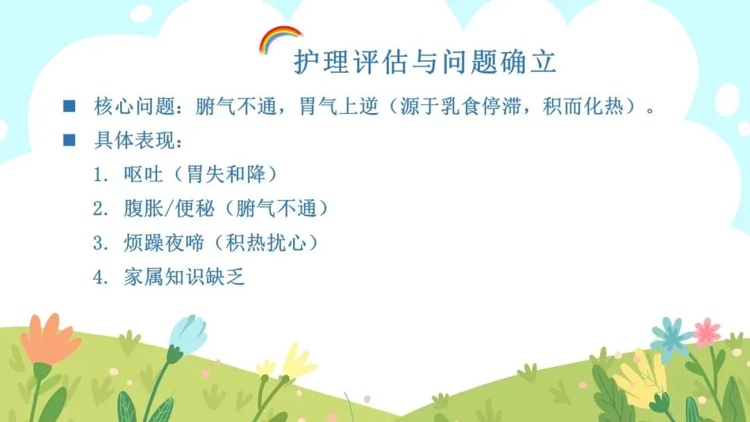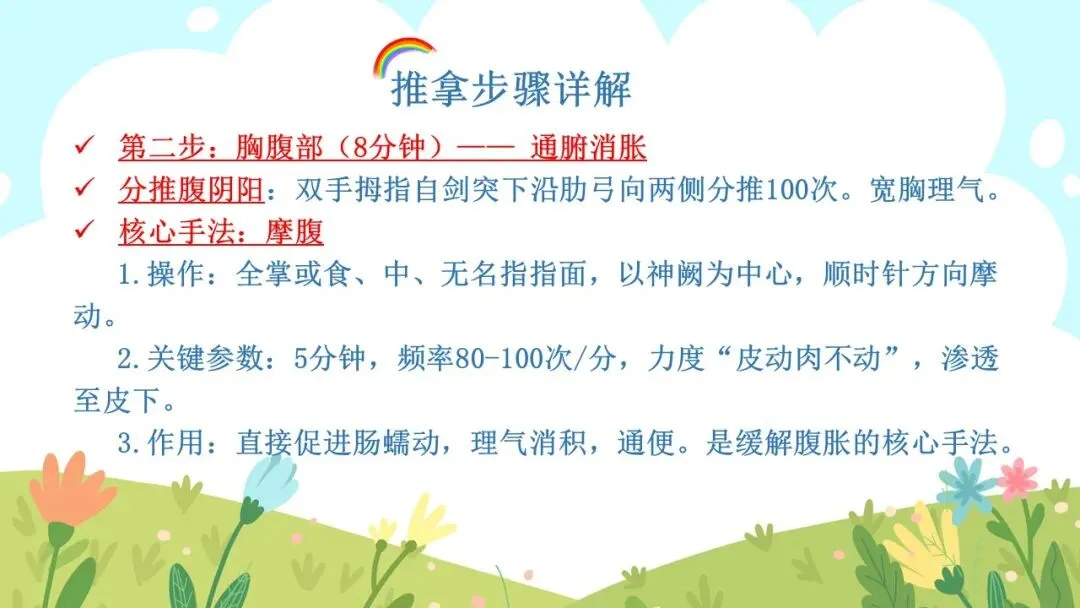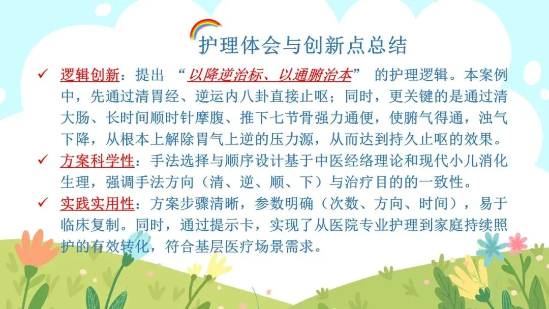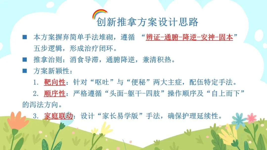 课件以真实个案为依托,先详细呈现15个月患儿的病情、体征及中西医诊断结果,明确“腑气不通,胃气上逆”的核心问题。核心内容围绕创新推拿方案展开,遵循“辨证-通腑-降逆-安神-固本”逻辑,详解头面上肢、胸腹部、腰背部及下肢三大部位的推拿步骤,含清胃经、顺时针摩腹等关键手法的操作规范与功效。