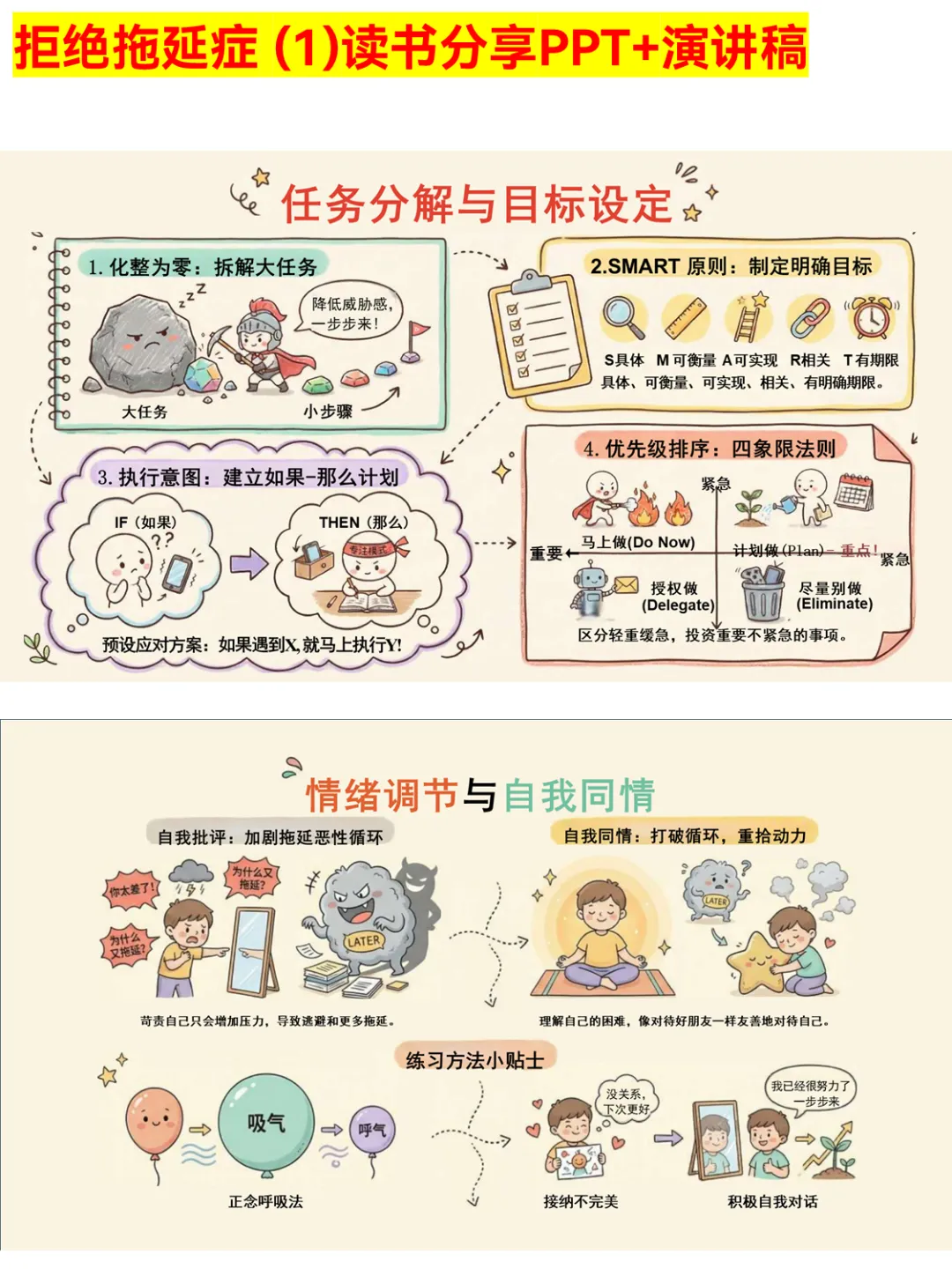 还在被拖延症折磨?这份《拒绝拖延症》PPT太实用啦!明确指出拖延症不是懒惰,而是自我调节失败的心理现象,还总结了逃避型、决策型等四种主要类型。里面有93.33%大学生、86%职场人士存在拖延习惯的真实数据,戳中很多人!更有番茄工作法、四象限法则等科学时间管理方法,还有情绪调节、环境优化的技巧,帮你打破拖延怪圈,拥抱高效人生~ 不管是备考学生、职场新人还是被拖延困扰的朋友,都能从中找到解决方案! #拒绝拖延症 #拖延症自救 #高效时间管理 #大学生学习技巧 #职场效率提升 #告别拖延 #自我提升 #PPT干货 #克服拖延 #时间管理方法