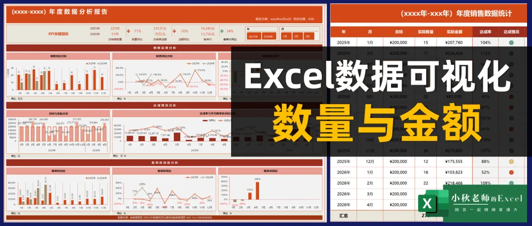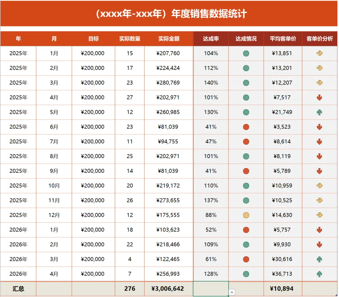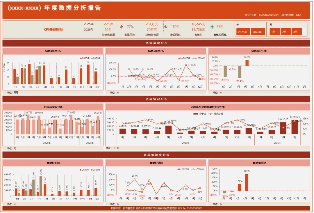 模版分析维度:销售指标分析、达成情况分析、客单价分析