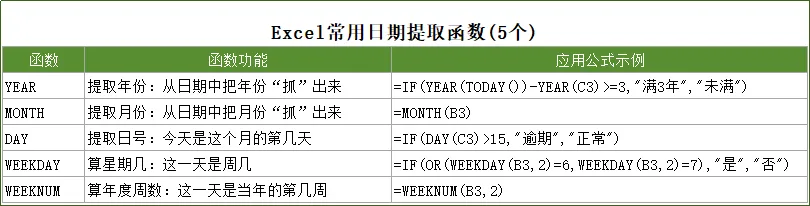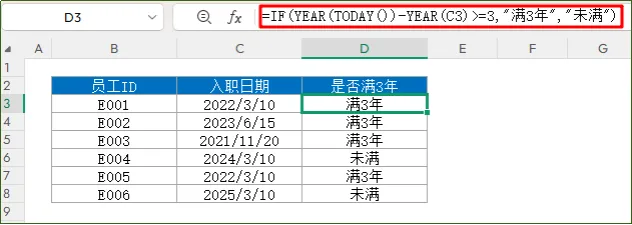 =IF(YEAR(TODAY())-YEAR(C3)>=3,"满3年","未满")=MONTH(日期)