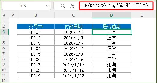 =IF(DAY(C3)>15,"逾期","正常")=WEEKDAY(日期, [返回类型])