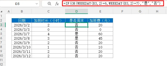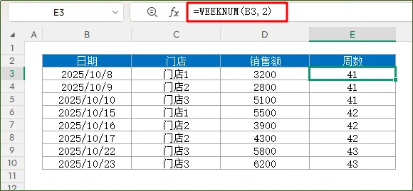 =IF(OR(WEEKDAY(B3,2)=6,WEEKDAY(B3,2)=7),"是","否")=WEEKNUM(日期, [返回类型])