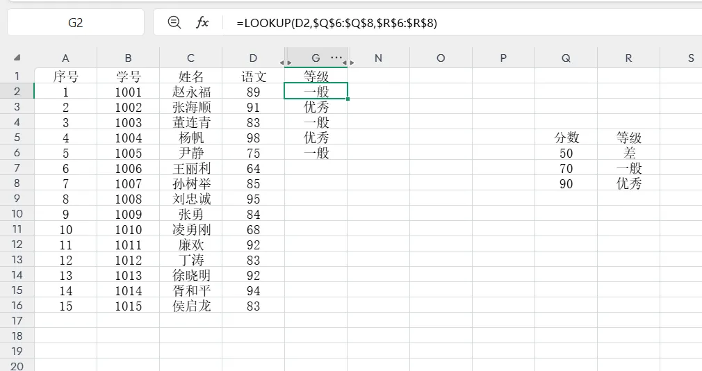 =lookup(分数值,$ $:$ $ ,$ $ :$ $) ---(区间下限,对应等级) 见图6