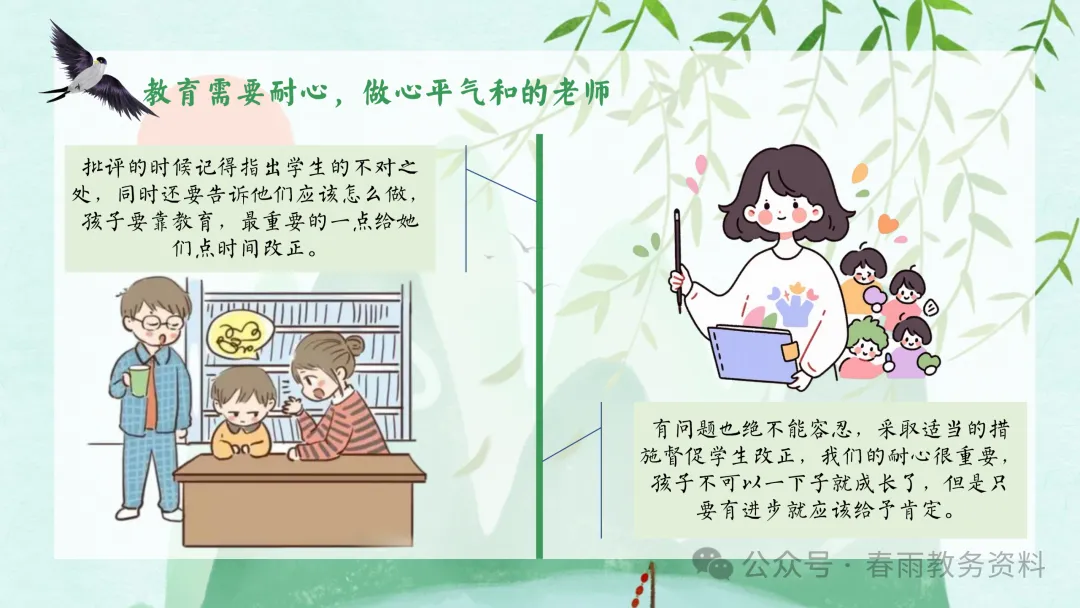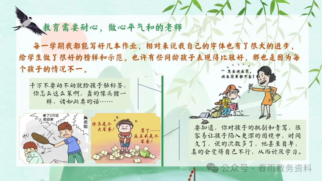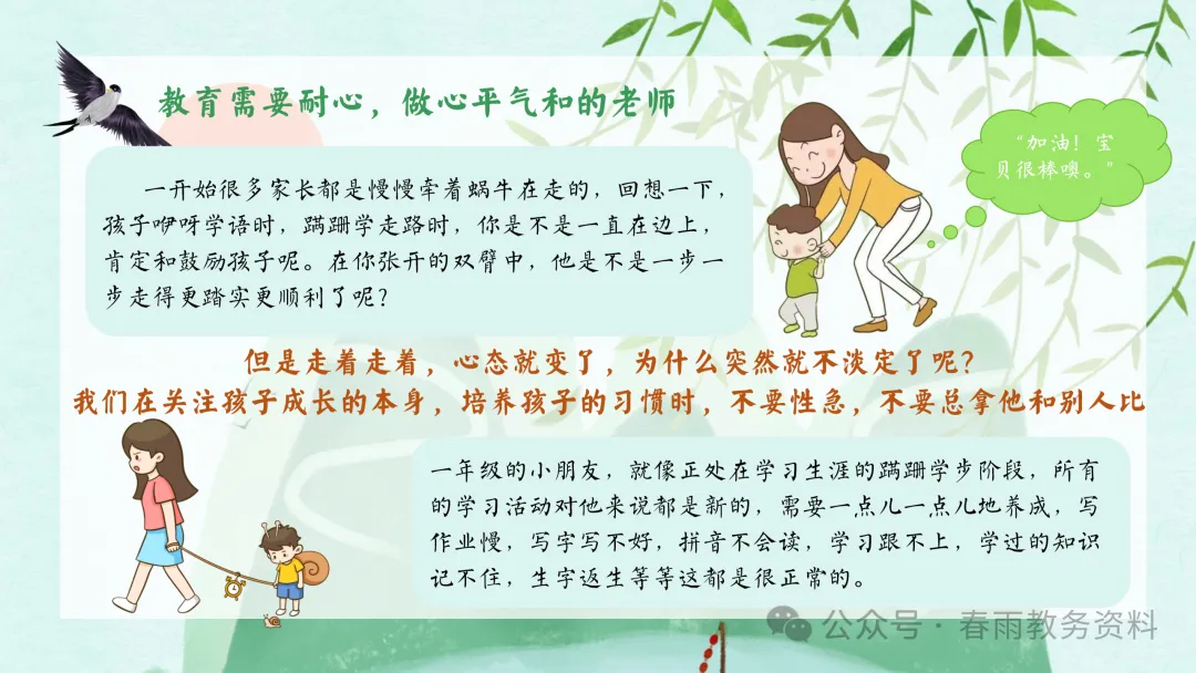 家校共育是现在教育的重要组成部分,我在这里强调的是两个字,就是“有效”,我们每一次的沟通都要取得一定的成效,那么我们的这个沟通才是成功的。对于溺爱型的家长子谈话交流,开学这两个多月以来,他现在让我找家长的次数也越来越少,明眼可见的进步了。我们班的李汶俊,一开始很叛逆,干什么都积极性不高,我经常让他帮我做事情,并主动表扬他,下课他主动跟我说话的时候,我也会搂着他们对生命最深的尊重。教育是慢的艺术,一年级正是这漫长旅程中温暖而关键的第一步。我愿继续以平和的心,牵着孩完整版电子资料 获取方式: