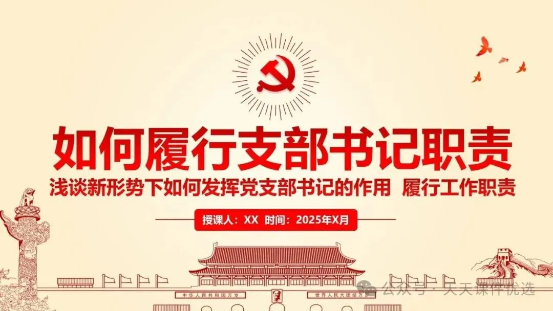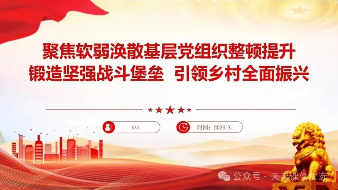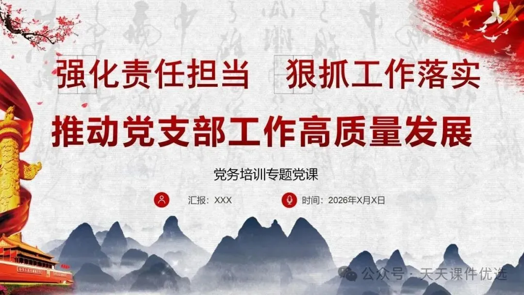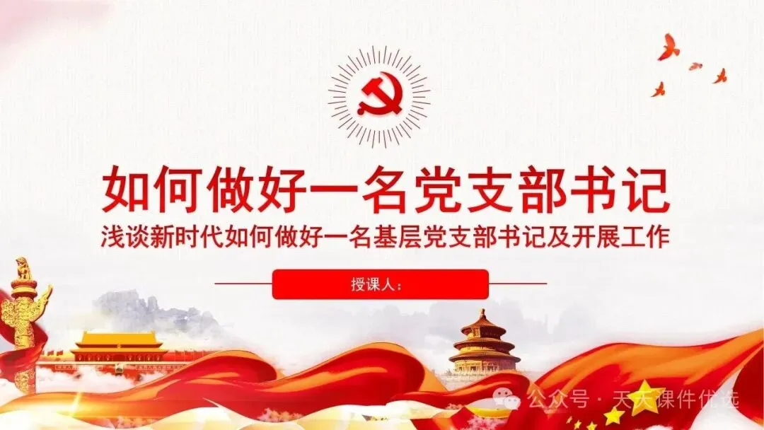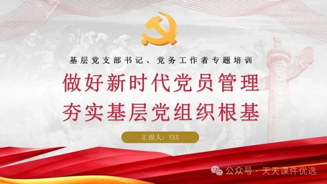 为帮助基层党务工作者提升履职能力、规范工作流程,我们特别整理了13篇基层党建专题培训党课PPT。内容涵盖支部书记素养提升、党员教育管理、党务工作实操规范、党建业务融合发展等多个方面,系统解答了基层党建 “做什么、怎么做” 的问题。内容详实、条理清晰,是基层党组织加强自身建设、提升党建工作质量的 “活字典” 和 “工具书”。围绕国企基层党支部书记履职展开,从提升学习、业绩、统筹等能力夯实履职基础,到做好合力、结合、融入文章抓实工作实效,再到以同心、同向等举措激发组织活力,如何做好党建工作,凝聚力量助推企业改革。聚焦支部书记履职能力提升,明确所需政治、专业、工作素养,点出履职常见问题,从学习、工作、奉献、律己四方面给出合格建设路径,还结合实际讲工作开展方法,对国企基层支部书记开展工作具有指导意义。聚焦基层党支部书记的核心工作职责,本材料先明确书记应具备的综合素质与工作改进方向,再深入阐释党员管理各环节的工作要求与实操举措,内容贴合基层实际、条理清晰,为做好基层党建工作、建强党员队伍提供有力支撑。立足基层党建工作实际,双维度展开党建工作指导,一是明晰党支部书记的素养要求、工作不足与改进方向,二是详解党员发展、教育、管理等核心工作的实操举措,内容详实、指导性强,适合基层党务工作者学习运用。聚焦支部书记核心职责,这份材料融合机关与基层党建工作要点,既讲如何用心用情做好党员干部的贴心人,又明确基层支部书记的素质要求、合格标准与创新工作方法,兼具理论性与实操性,助力建强基层党组织。双维度覆盖基层党建核心工作,既详细解读党支部七项组织生活制度的具体落实标准,又围绕支部书记履职,提出筑牢初心、交心暖心等实践要求,内容详实、指导性强,助力提升党建工作规范化水平。 锻造坚强战斗堡垒 引领乡村全面振兴