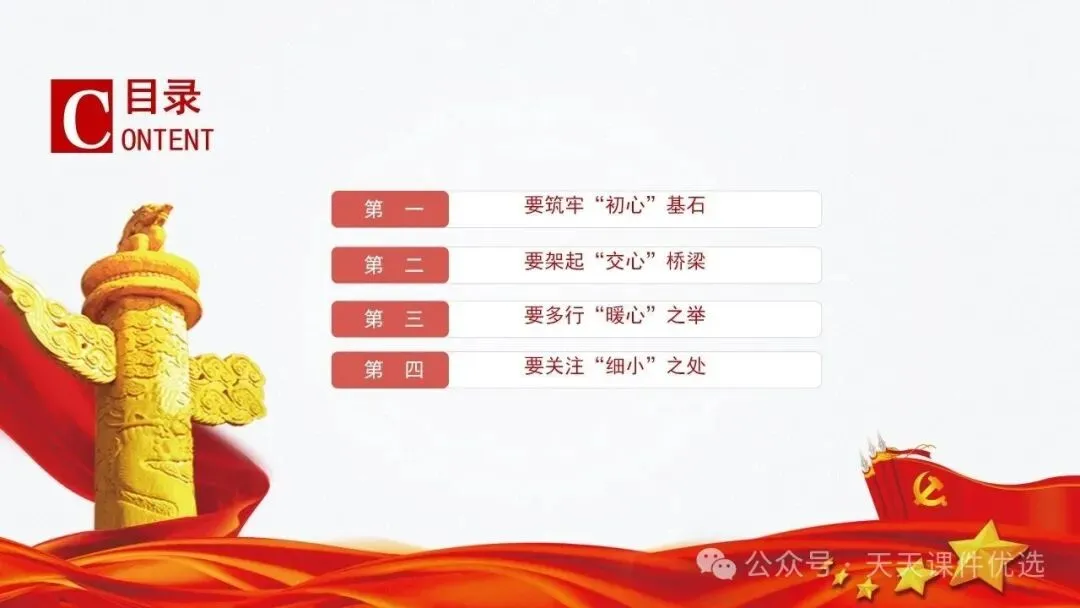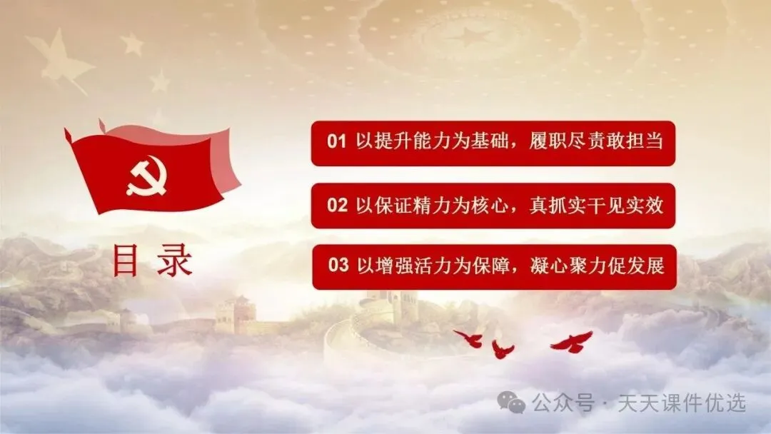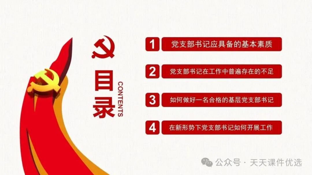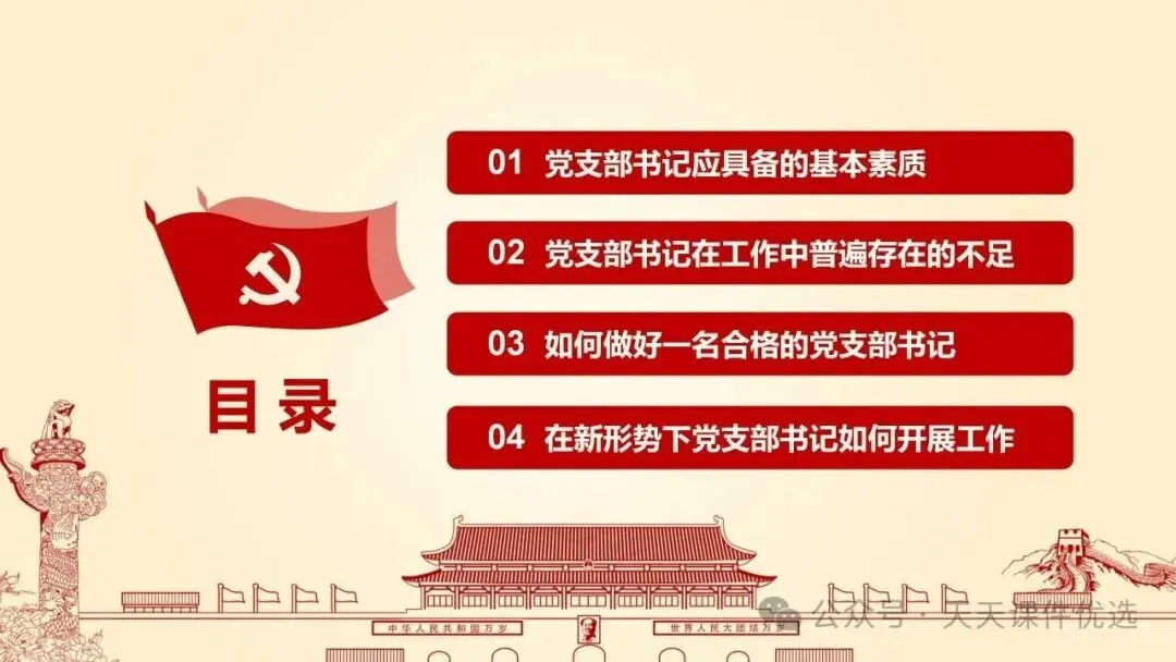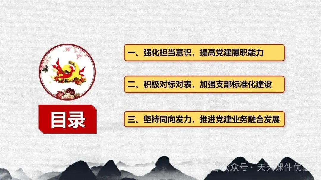 为帮助基层党务工作者提升履职能力、规范工作流程,我们特别整理了13篇基层党建专题培训党课PPT。内容涵盖支部书记素养提升、党员教育管理、党务工作实操规范、党建业务融合发展等多个方面,系统解答了基层党建 “做什么、怎么做” 的问题。内容详实、条理清晰,是基层党组织加强自身建设、提升党建工作质量的 “活字典” 和 “工具书”。围绕国企基层党支部书记履职展开,从提升学习、业绩、统筹等能力夯实履职基础,到做好合力、结合、融入文章抓实工作实效,再到以同心、同向等举措激发组织活力,如何做好党建工作,凝聚力量助推企业改革。聚焦支部书记履职能力提升,明确所需政治、专业、工作素养,点出履职常见问题,从学习、工作、奉献、律己四方面给出合格建设路径,还结合实际讲工作开展方法,对国企基层支部书记开展工作具有指导意义。聚焦基层党支部书记的核心工作职责,本材料先明确书记应具备的综合素质与工作改进方向,再深入阐释党员管理各环节的工作要求与实操举措,内容贴合基层实际、条理清晰,为做好基层党建工作、建强党员队伍提供有力支撑。立足基层党建工作实际,双维度展开党建工作指导,一是明晰党支部书记的素养要求、工作不足与改进方向,二是详解党员发展、教育、管理等核心工作的实操举措,内容详实、指导性强,适合基层党务工作者学习运用。聚焦支部书记核心职责,这份材料融合机关与基层党建工作要点,既讲如何用心用情做好党员干部的贴心人,又明确基层支部书记的素质要求、合格标准与创新工作方法,兼具理论性与实操性,助力建强基层党组织。双维度覆盖基层党建核心工作,既详细解读党支部七项组织生活制度的具体落实标准,又围绕支部书记履职,提出筑牢初心、交心暖心等实践要求,内容详实、指导性强,助力提升党建工作规范化水平。 锻造坚强战斗堡垒 引领乡村全面振兴