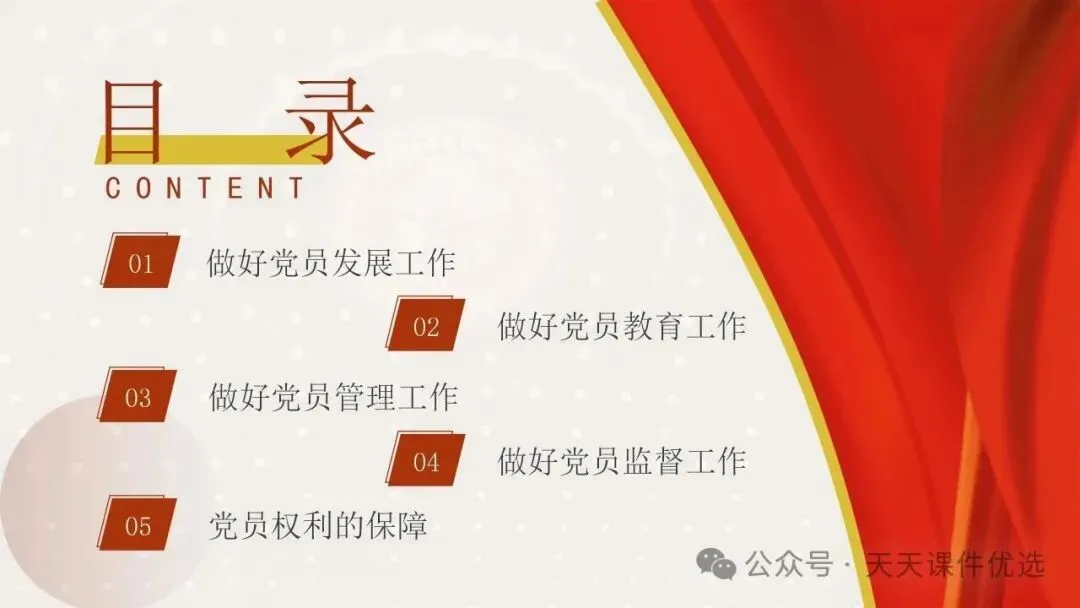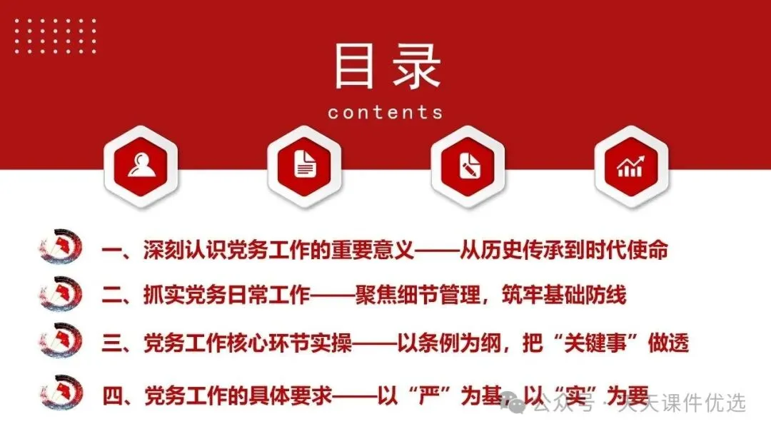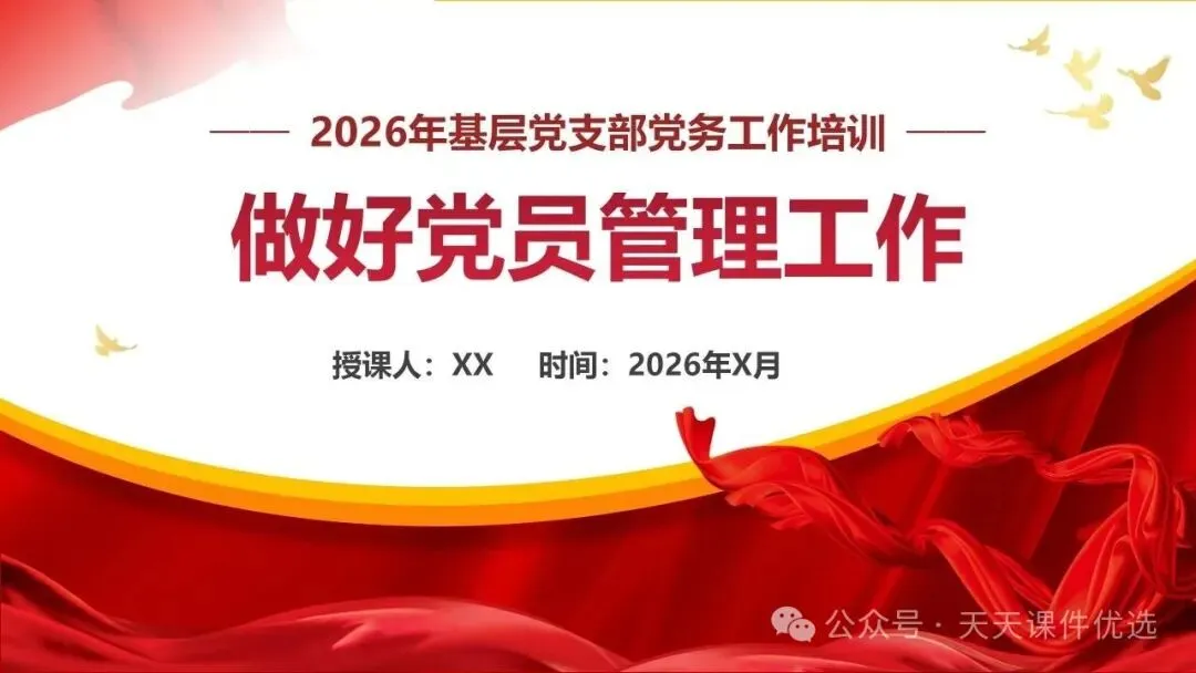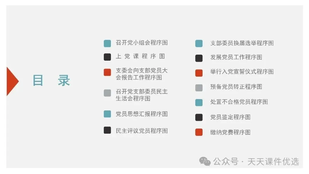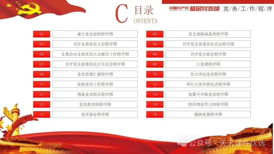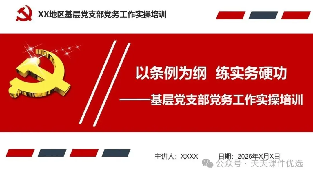 紧扣锻造乡村振兴战斗堡垒核心,既深入讲解软弱涣散村党组织整顿的靶向举措与长效机制,破解乡村党建发展难题;又详细梳理党支部七项组织生活制度的具体要求,为乡村支部规范化建设立规矩、明方法,助力乡村全面振兴。兼具基层党务工作规范与乡村党建提升方案,以流程图形式清晰呈现 18 项党支部党务工作全流程,又聚焦乡村振兴,系统讲解软弱涣散基层党组织整顿的靶向举措与落地方法,内容详实、指导性强,是基层党务工作者的实用手册。整合基层党支部 13 项与 18 项党务工作流程图,全覆盖支部建设、会议召开、党员发展、教育管理等核心工作,以清晰的流程拆解每一项党务操作步骤,环节明确、实操性强,是基层党务工作者开展标准化党建工作的实用指南。立足党务干部队伍建设与基层党建实务,这份党课一方面从思想、行动、纪律层面给出党务干部能力提升路径,另一方面系统梳理基层党支部 13 项党务工作流程,从会议召开到党员管理全覆盖,流程清晰、要求明确,为党务工作高质量开展提供全面支撑。11、强化责任担当狠抓工作落实推动党支部工作高质量发展立足党务干部队伍建设与基层党建实务,这份党课一方面从思想、行动、纪律层面给出党务干部能力提升路径,另一方面系统梳理基层党支部 13 项党务工作流程,从会议召开到党员管理全覆盖,流程清晰、要求明确,为党务工作高质量开展提供全面支撑。以问题为导向,针对当前党员管理工作中的重点难点,系统梳理了从入党积极分子培养到党员日常教育管理的全链条工作要点,并明确了各项工作的原则、流程和责任。内容指导性强,有助于提升党员管理工作的规范化、科学化水平。13、以条例为纲练实务硬功——基层党支部党务工作实操培训讲稿以问题为导向,针对党务工作中常见的程序不规范、流程不清晰等问题,依据最新条例和规定,详细拆解了从支部建设到党员发展,从会议组织到材料归档等各项工作的具体操作步骤。讲解深入浅出、条理分明,是提升基层党务工作规范化水平的必备教材。
