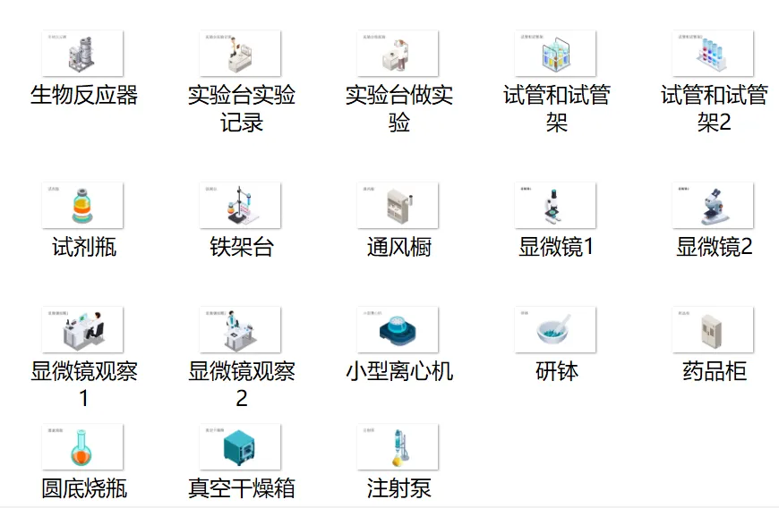 生物反应器、实验台实验记录、实验台做实验、试管和试管架、试管和试管架 2、试剂瓶、铁架台、通风橱、显微镜 1、显微镜 2、显微镜观察 1、显微镜观察 2、小型离心机、研钵、药品柜、圆底烧瓶、真空干燥箱、注射泵。