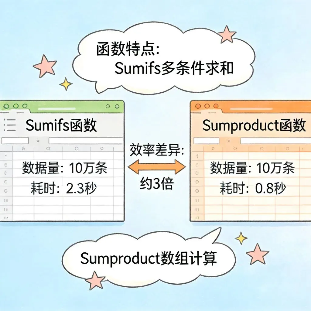 测试结果让我大吃一惊:- Sumifs函数:耗时2.3秒 - Sumproduct函数:耗时0.8秒