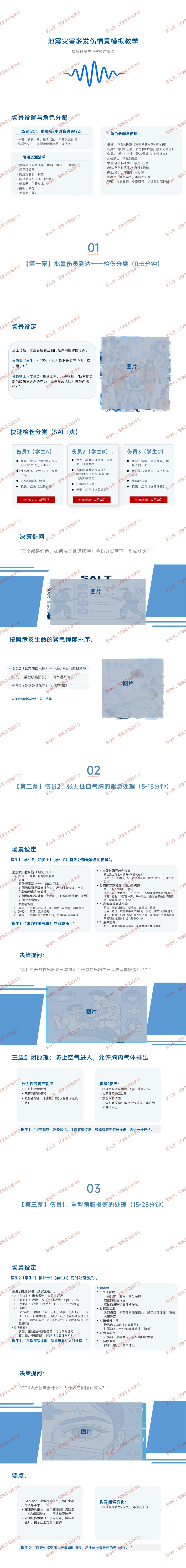 角色分配:3 名伤员分别模拟重型颅脑损伤 + 多发伤、张力性血气胸 + 腹部闭合伤、骨盆骨折 + 失血性休克;另设分检护士、2 名创伤科医生、2 名护士助手,其余学生为观察员,临床教师担任导师。