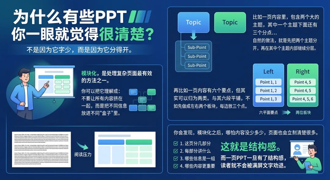 很多人的PPT之所以让人看不下去,不是因为字多,而是因为没有结构。