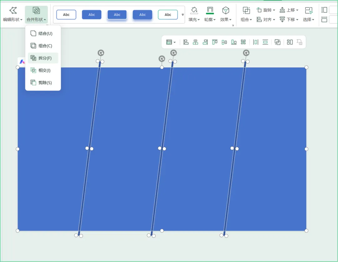 全选所有形状,在【合并形状】中选择【拆分】,删除多余的形状。2、将之前准备的图片复制到页面中,依次对形状进行图片填充。填充方式:选中图片进行剪切(或Ctrl+X),点击右侧【填充】-【图片或纹理填充】-【图片填充】-下拉选择【剪切板】。再适当调整形状大小。