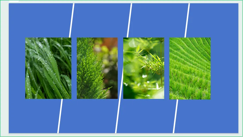 我昨天收到领导发来的几张图片,让我做成PPT目录页,而且领导要求非常特别:要有层次感,体现出春天绿意盎然的景象!我就用前段时间学到的“形状拆分+图片填充进形状+阴影效果+文字效果”进行设计。插入一个长矩形,再复制两个,三个长矩形进行水平居中设置。