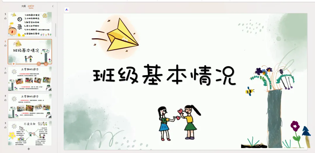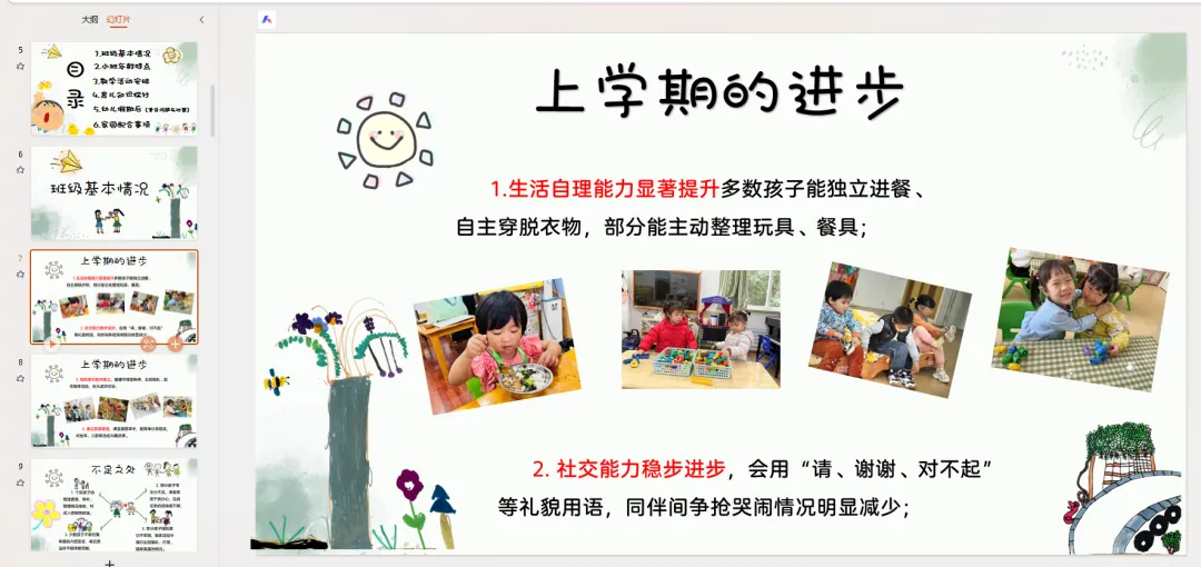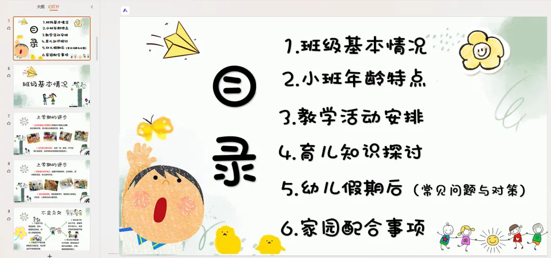 接下来,我将围绕六个核心方面,和大家详细交流本学期班级工作、幼儿发展以及家园共育的相关内容,分别是: