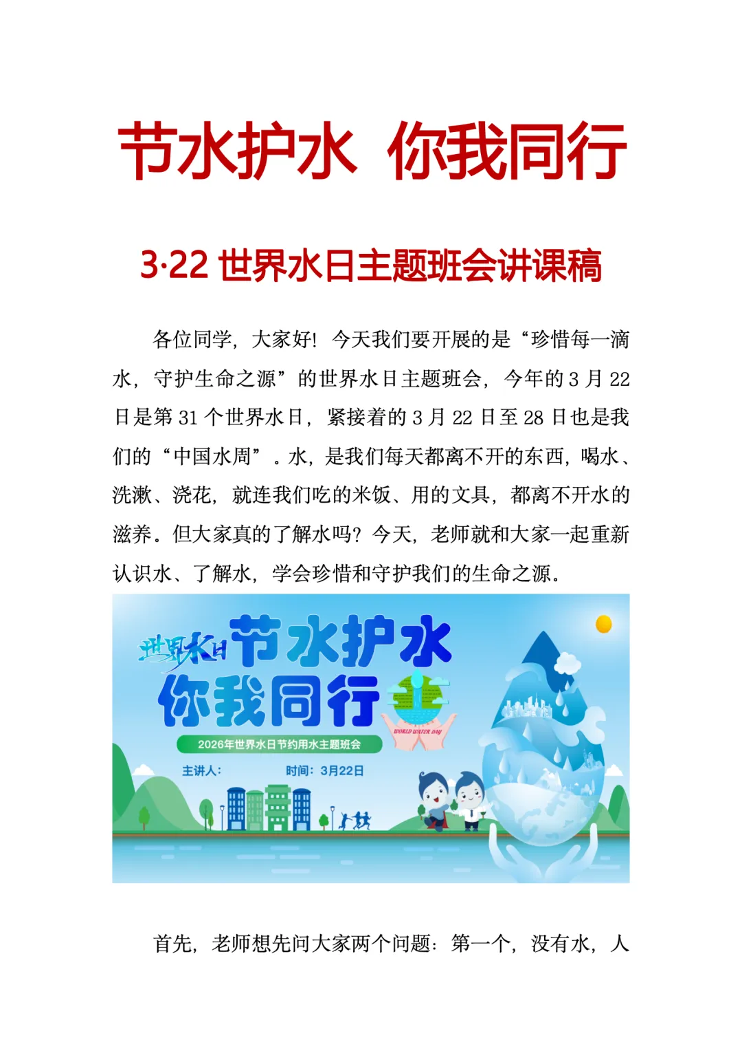 >2026年世界水日主题班会PPT课件教案逐字稿|节水护水 你我同行