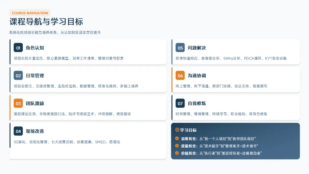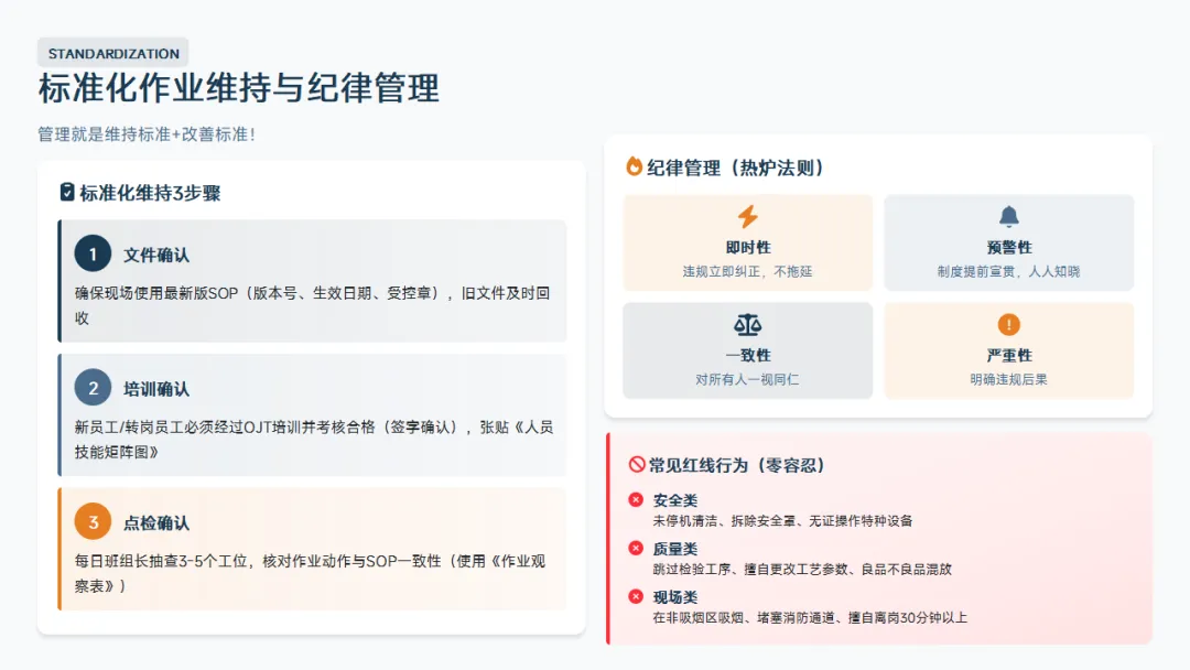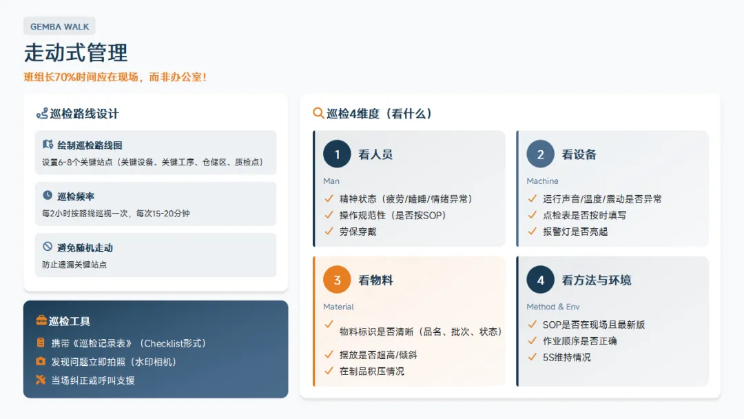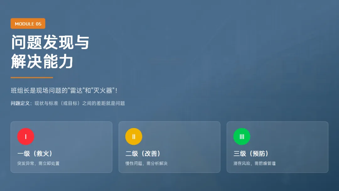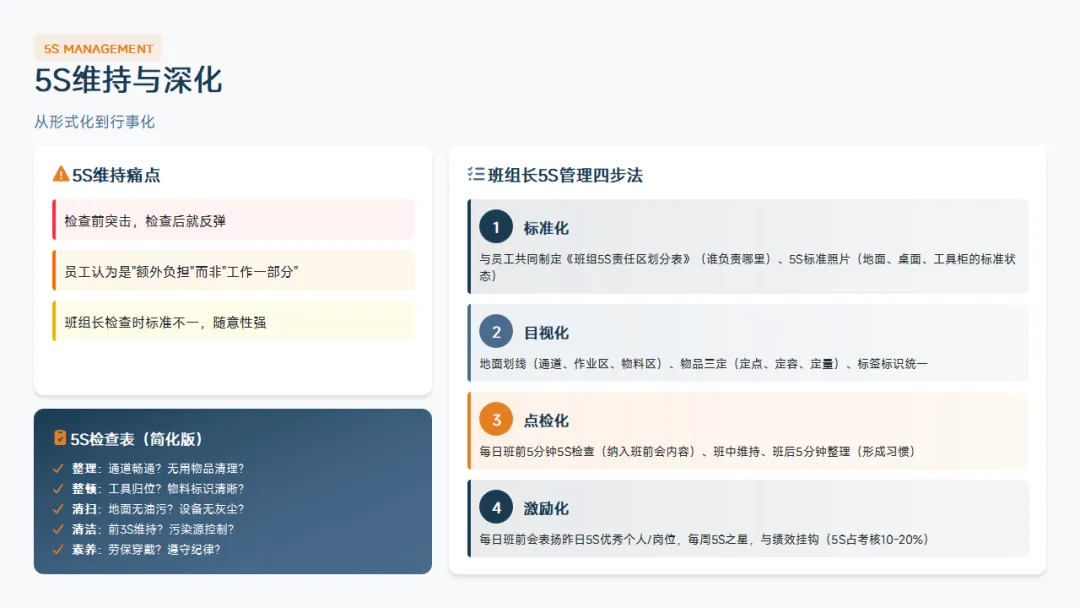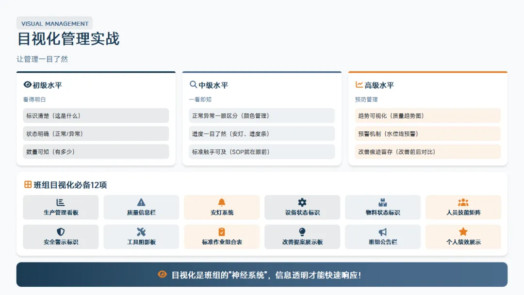 :5S、目视化、标准化作业、精益基础。这是班组长区别于普通操作工的核心知识。