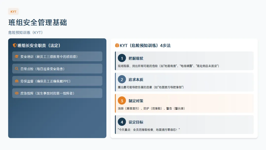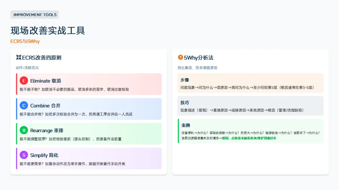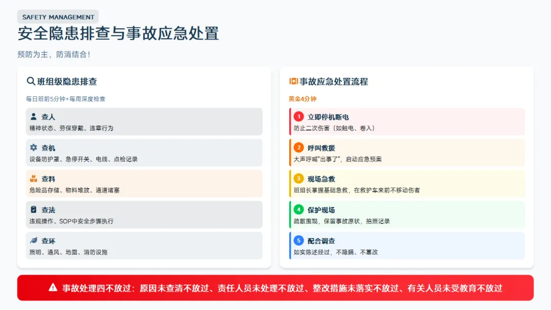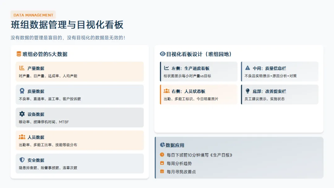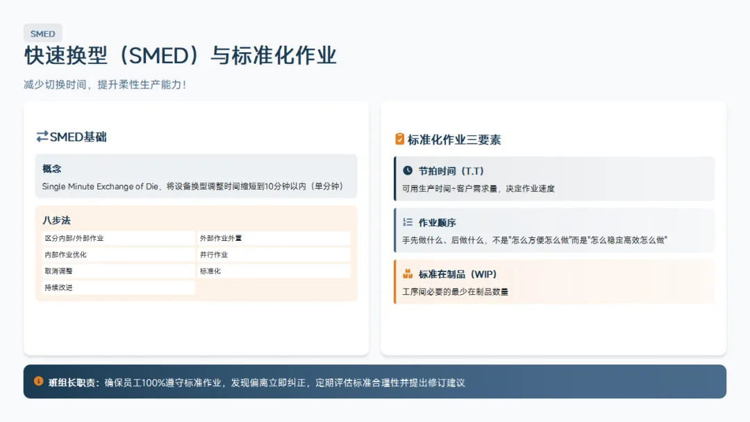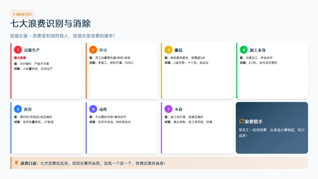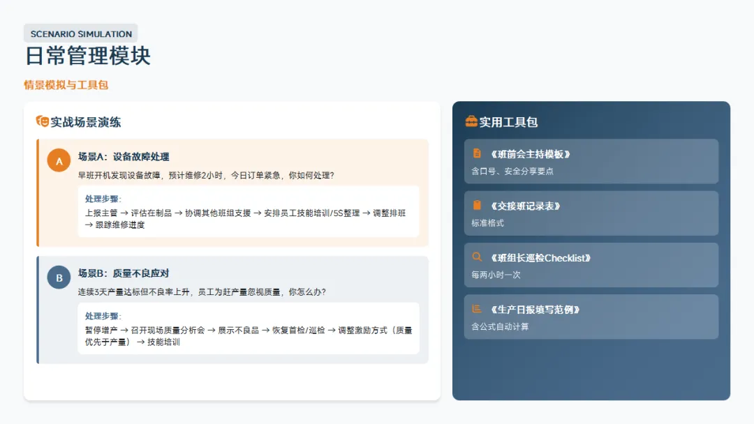 :5S、目视化、标准化作业、精益基础。这是班组长区别于普通操作工的核心知识。