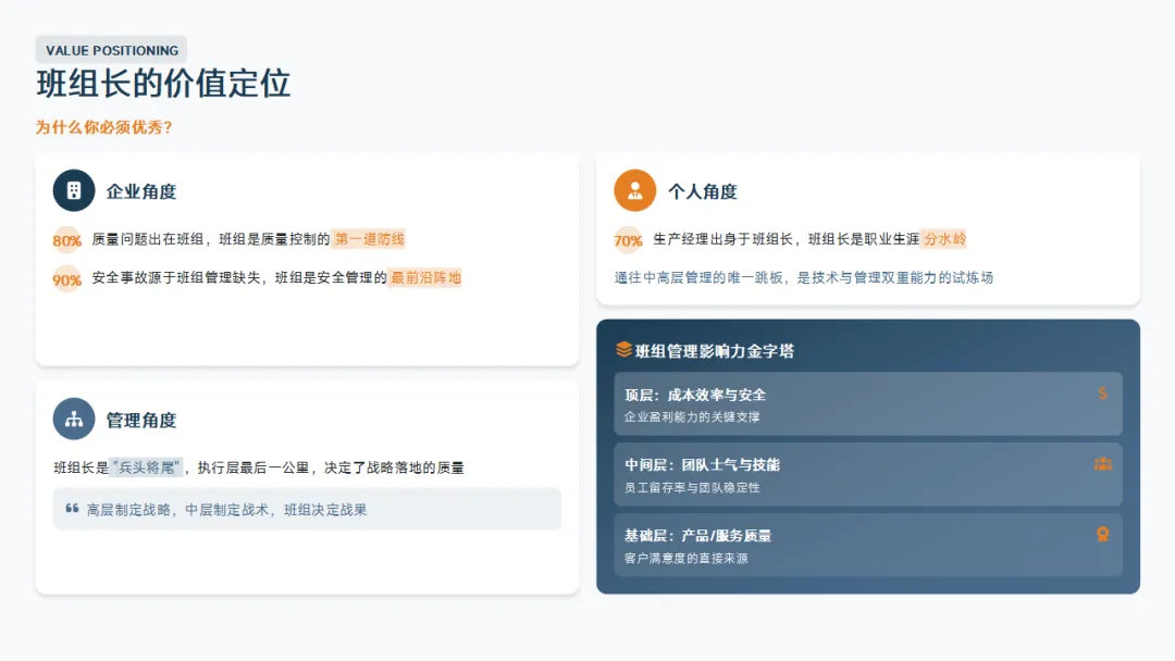 这意味着什么?意味着班组长是企业质量控制的第一道防线,是安全管理的最前沿阵地。如果班组长不优秀,企业的质量体系和安全生产就是纸上谈兵。