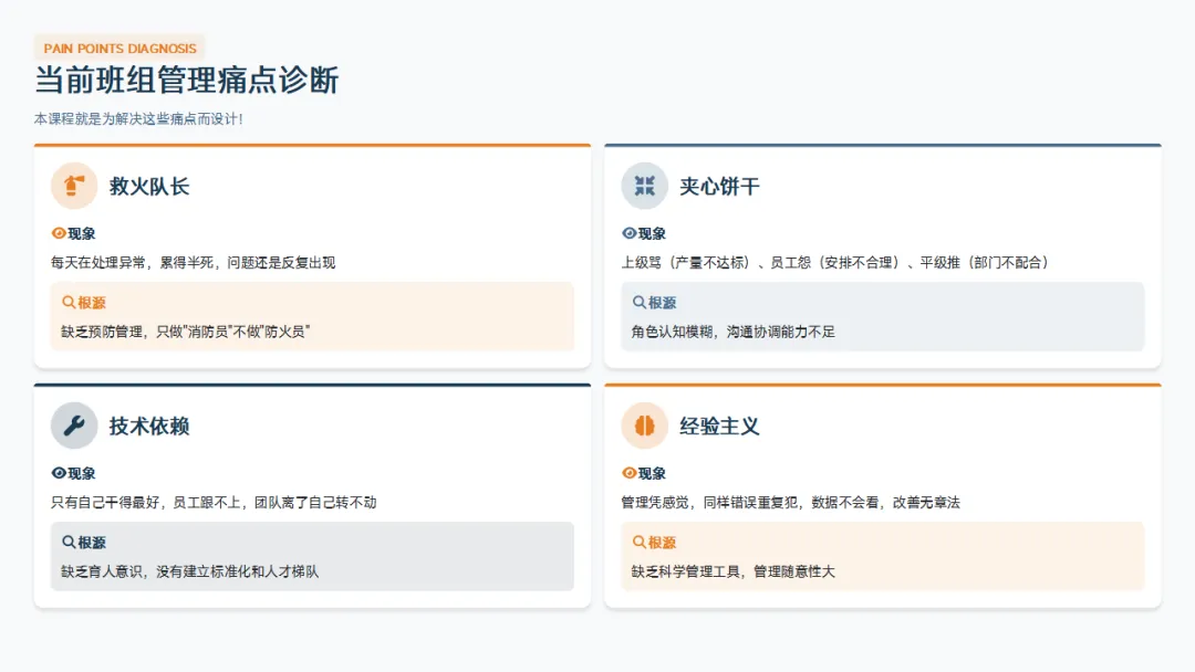 在正式学习之前,我们先诊断一下"病情"。目前班组长普遍存在四大痛点: