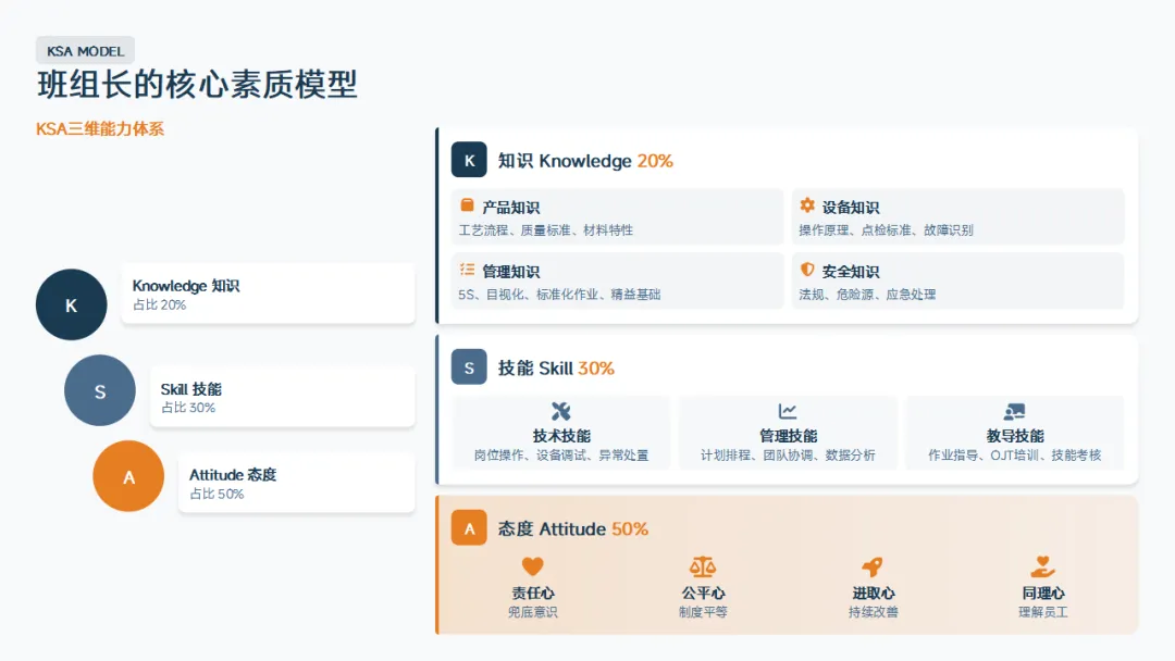 什么样的人才能成为优秀的班组长?我们总结为KSA三维能力体系。