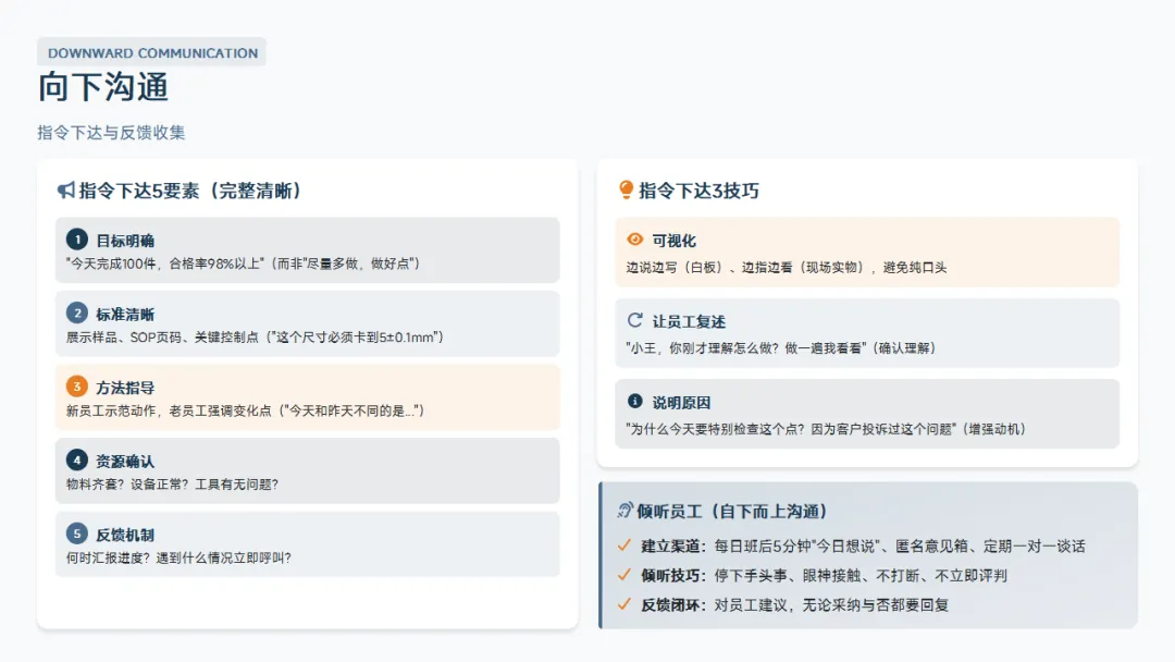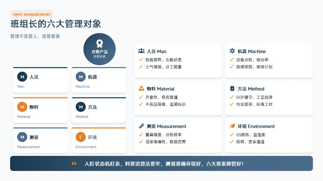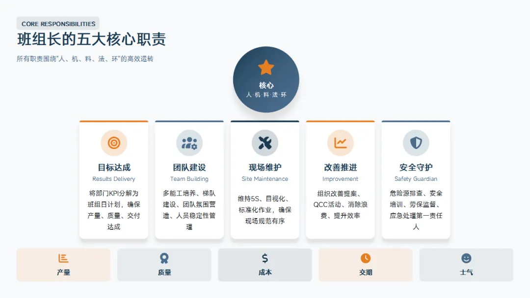 你是这个团队的指挥官。注意,不是"高级操作工"。很多班组长一忙起来就自己上机台操作,这是角色错位。你是指挥官,你的职责是排兵布阵、协调资源、监督执行,而不是亲自冲锋陷阵。