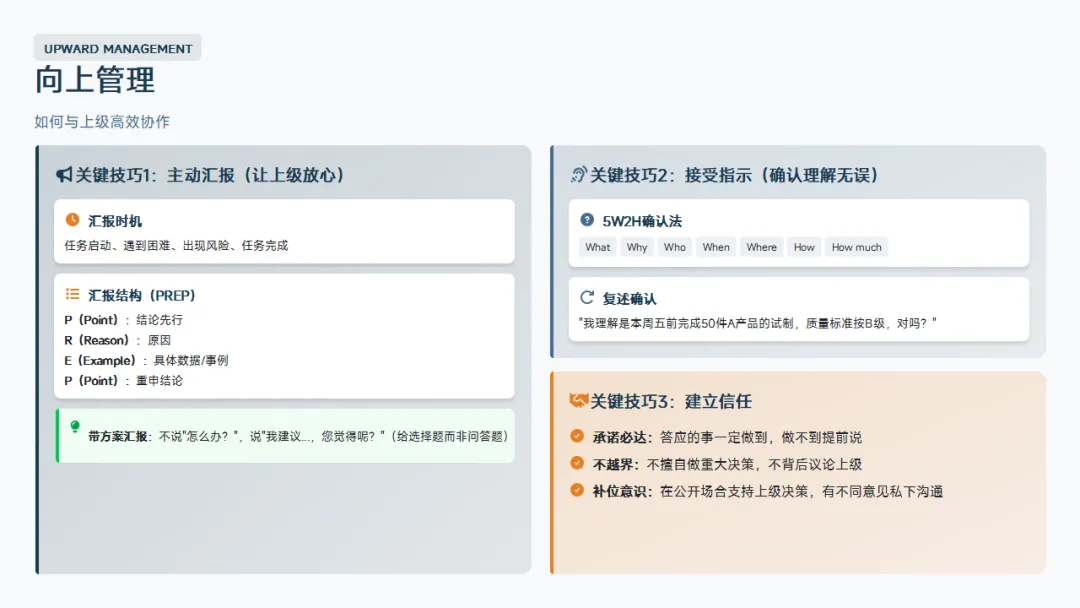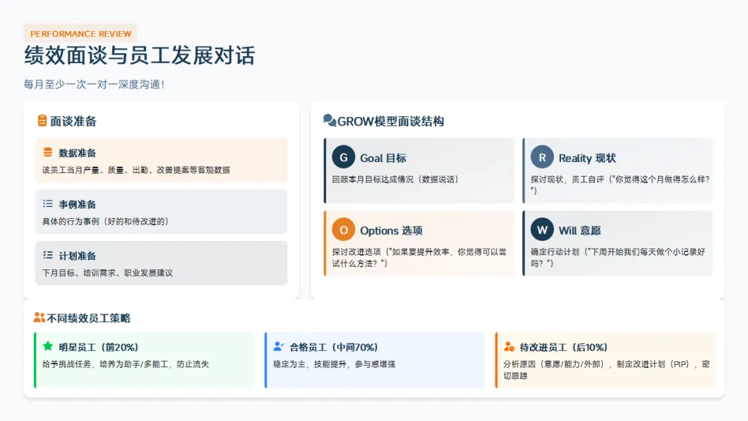 你是员工的教练。员工的成长是你的责任。如果员工技能不提升,说明你这个教练不合格。教练者不是简单地告诉员工"这样做",而是要告诉他"为什么要这样做"、"怎样能做得更好"。