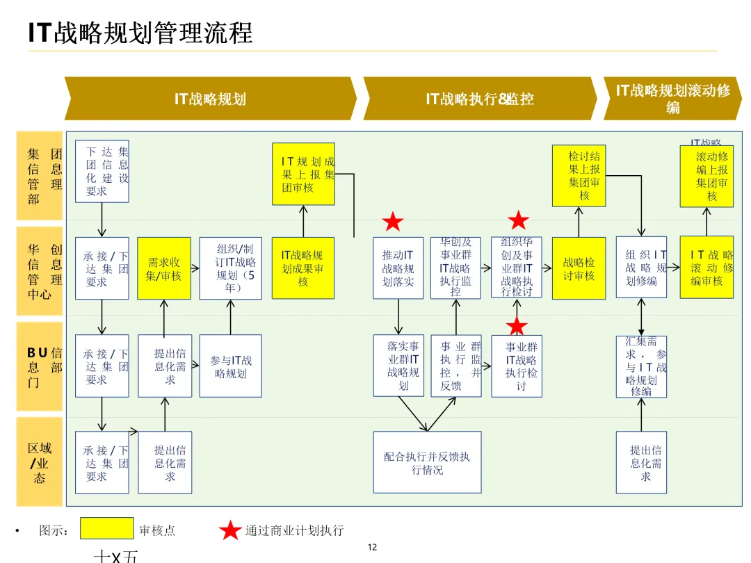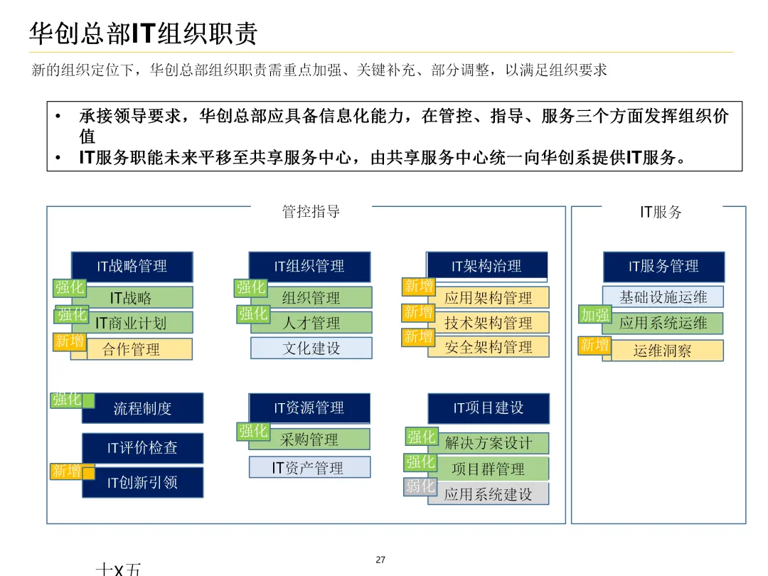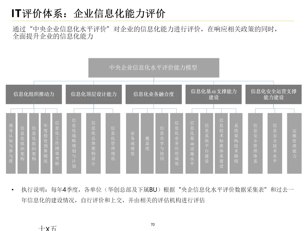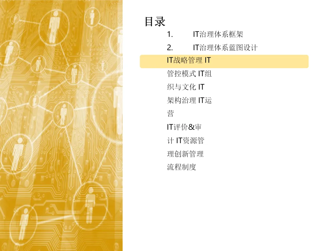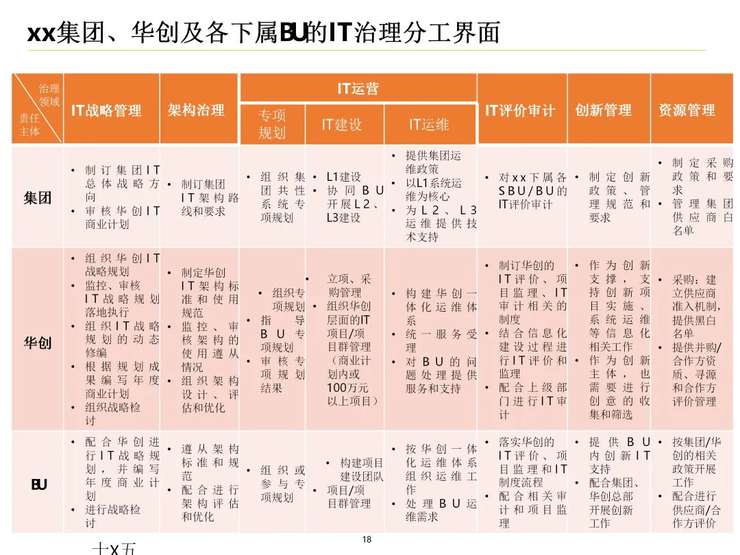 声明:本文内容来源于公众号“数字化战略咨询”,版权归原作者所有(如侵权,扫描上方二维码联系删除)。风陵渡进行深度解读,欢迎大家转载分享。集团IT治理蓝图与机制规划通常围绕战略协同、架构治理、运营管控、评价风控、资源管理、创新管理六大维度展开,以下是具体规划内容:IT战略管理战略规划:结合集团业务战略,制定IT战略方向,明确IT投资计划、项目优先级及演进路线。战略执行:通过信息化项目规划、建设及系统运营,推动IT战略落地。战略监控:建立管理看板、战略预警机制,实时跟踪战略执行情况。战略检讨与修编:定期组织战略检讨,根据业务变化和技术趋势动态调整战略。架构治理架构标准制定:定义企业级IT架构标准,涵盖应用架构、技术架构、数据架构等。架构设计评审:对信息化项目架构方案进行评审,确保符合架构标准。架构使用监控:监控架构在实际项目中的应用情况,及时发现并纠正偏差。架构优化变更:根据业务需求和技术发展,持续优化架构,支持业务创新。IT运营管控专项规划:制定IT专项规划,如基础设施规划、应用系统规划等。项目管理:建立项目管理体系,涵盖项目立项、实施、验收等全过程管理。运维管理:构建一体化运维体系,实现从被动运维向主动服务的转变,保障系统稳定运行。IT评价审计业绩合同考核:将IT工作纳入业绩合同,明确考核指标和评价标准。项目建设评价:对信息化项目进行全生命周期评价,评估项目质量、进度、成本等。内控审计:建立IT内控审计制度,防范IT风险,确保IT合规性。IT资源管理采购管理:规范IT采购流程,加强供应商管理,确保采购质量。资产管理:建立IT资产管理制度,实现IT资产的全生命周期管理。合作管理:加强与外部合作伙伴的合作,整合内外部资源,提升IT能力。创新管理创新机制建设:建立创新激励机制,鼓励员工提出创新想法和解决方案。创新项目实施:推动创新项目孵化,将创新成果转化为实际业务价值。创新资源管理:整合内外部创新资源,为创新项目提供支持。通过以上规划,集团可实现IT与业务的深度融合,提升IT治理水平,为集团战略目标的实现提供有力支撑。【未完...】