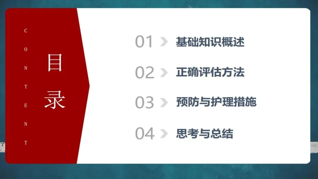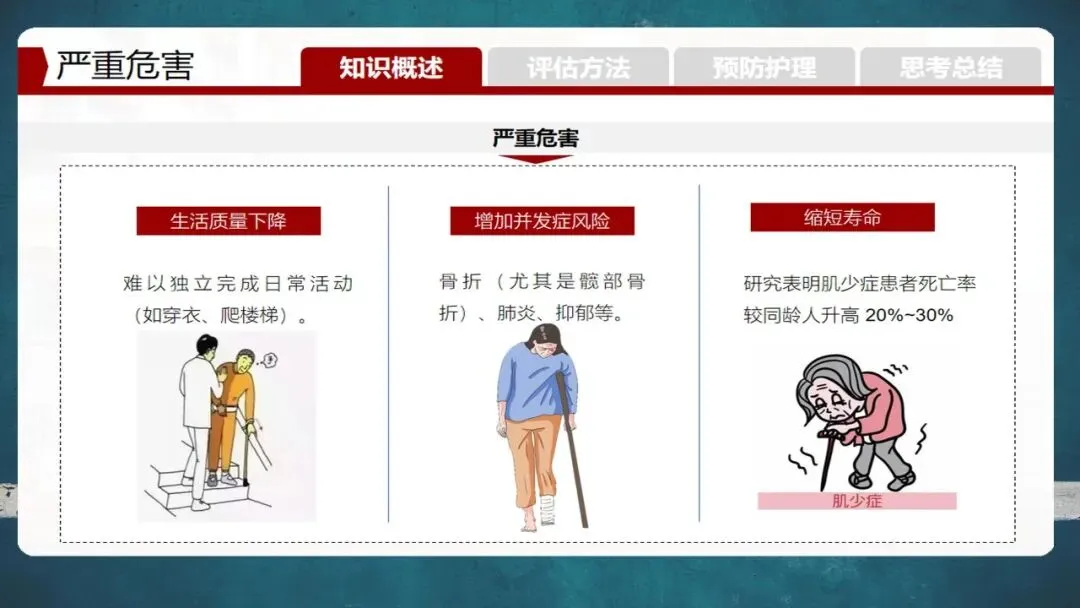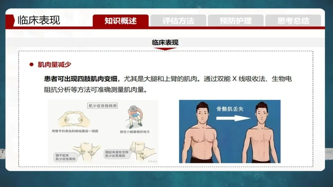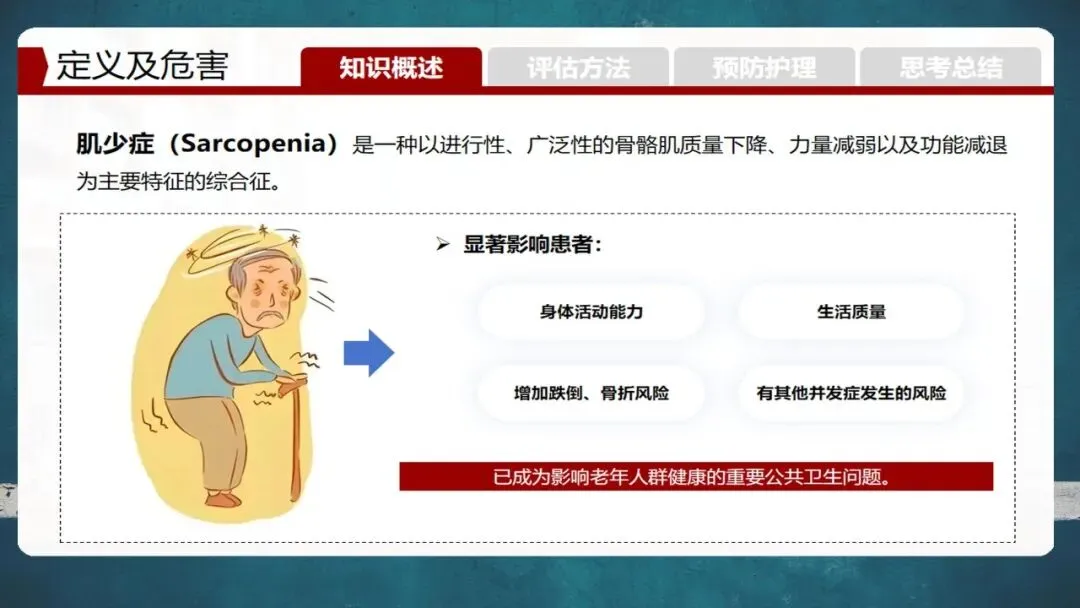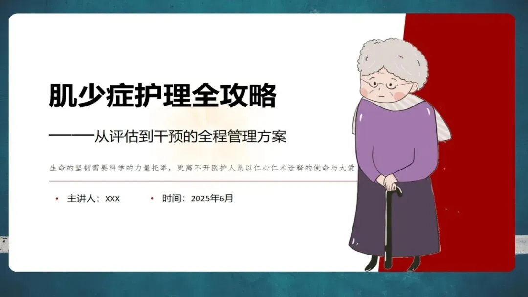 大家好!我是今天的宣讲人XXX。今天我分享的主题是《肌少症护理全攻略——从评估到干预的全程管理方案》。