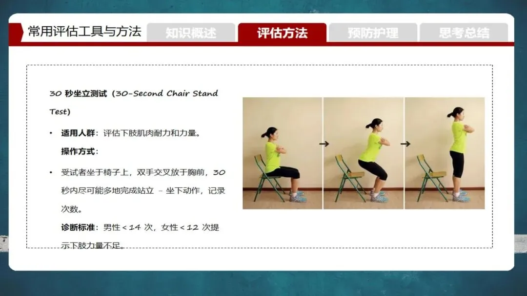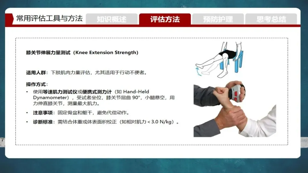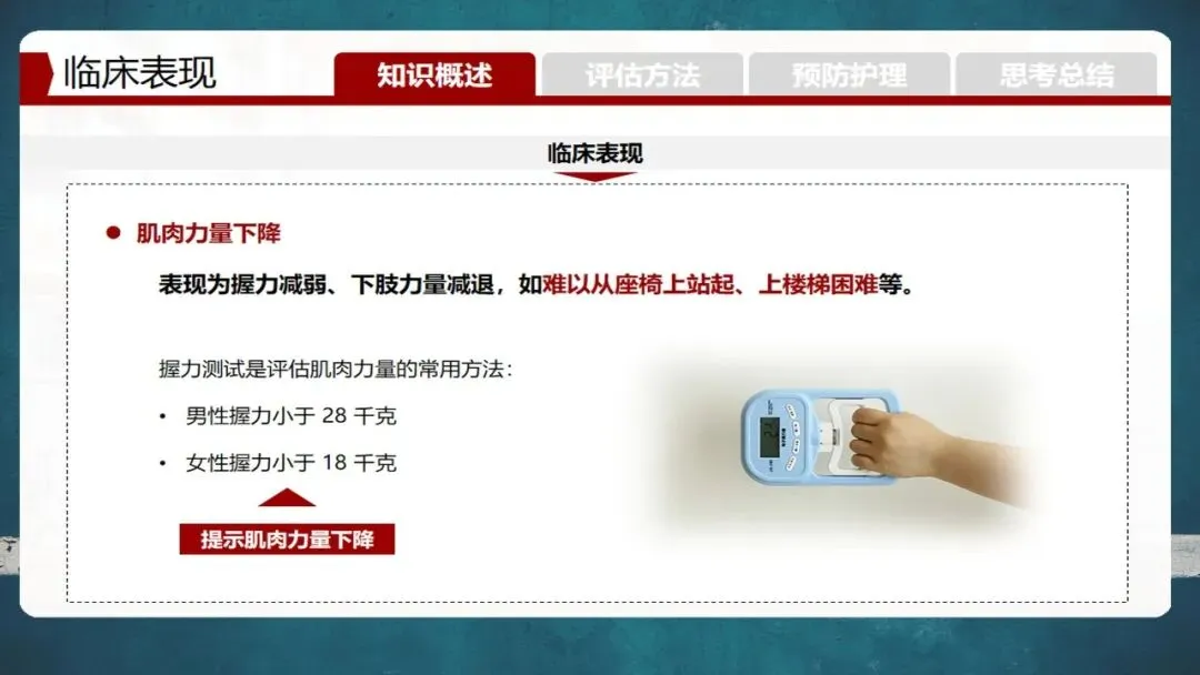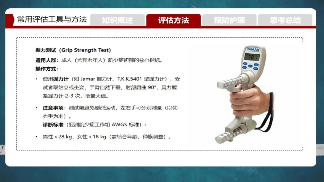我们常用的评估工具包括握力测试、膝关节伸展力量测试、起立行走测试、30秒坐立测试等。握力是筛查的核心指标,男性低于28千克、女性低于18千克,提示肌肉力量下降。步行速度、营养状况、肌肉量的测定(如双能X线吸收法)也是评估的重要维度。建议每3至6个月进行一次动态监测,追踪干预效果。