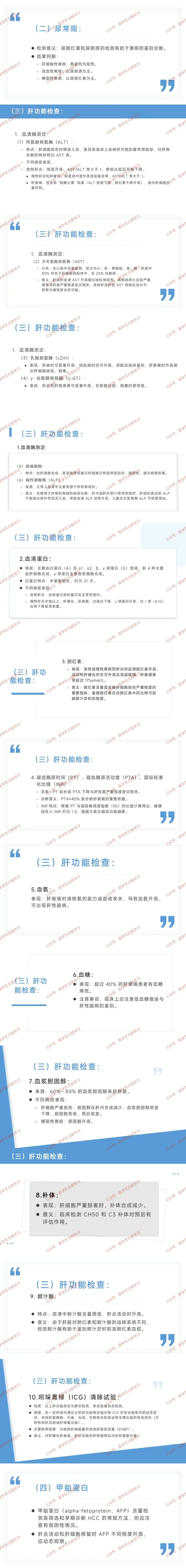 血清蛋白:由白蛋白(A)及 α1、α2、β、γ 球蛋白(G)组成,前 4 种肝细胞合成,γ 球蛋白浆细胞合成;白蛋白半衰期 21 天;急性肝炎蛋白量正常,慢性肝炎中度以上 / 肝硬化 / 肝衰竭时白蛋白下降、γ 球蛋白升高,A/G 倒置。